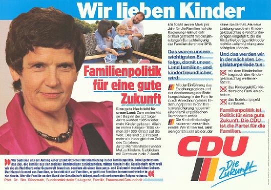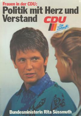 Seit 1981 ist Rita Süssmuth Mitglied der CDU. Bereits zwei Jahre später wird sie zur Vorsitzenden des Bundesfachausschusses Familienpolitik der CDU berufen. Bei den Vorbereitungen zum Bundesparteitag 1985 in Essen („Die neue Partnerschaft – Frauen in Beruf, Familie und Politik“) hat sie näheren Kontakt zu CDU-Generalsekretär Heiner Geißler. Als sich Geißler wenig später entschließt, als Bundesminister für Jugend, Familie und Gesundheit zurückzutreten, um sich auf sein Amt als Generalsekretär der CDU zu konzentrieren, schlägt er Bundeskanzler Helmut Kohl Rita Süssmuth als seine Nachfolgerin vor. Der Anruf aus dem Bundeskanzleramt kommt für sie völlig überraschend. Trotz vieler Bedenken nimmt sie Mitte August 1985 das Angebot von Helmut Kohl an und löst Ende September 1985 Heiner Geißler als Bundesfamilienminister ab. Von Anfang an setzt sie sich als Ministerin für die Belange der Frauen ein. So erreicht Süssmuth 1986 die Umbenennung ihres Ministeriums in „Bundesministerium für Jugend, Familie, Frauen und Gesundheit“ und setzt 1987 die Übertragung verschiedener Zuständigkeiten u.a. für den Mutterschutz und die Gleichberechtigung aus anderen Ministerien an ihr Haus durch. Zur besseren Vereinbarkeit von Beruf und Familie werden 1985 die noch unter Geißler erarbeiteten Gesetze über Erziehungsgeld und Erziehungsurlaub verabschiedet. Damit haben erstmals alle Mütter und Väter einen Anspruch auf Erziehungsgeld. Außerdem erreicht Süssmuth die Anerkennung von Kindererziehungszeiten (Babyjahr) in der Rentenversicherung sowie eine deutliche Anhebung des steuerlichen Kinderfreibetrages.
