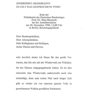 Nach der ersten gesamtdeutschen Bundestagswahl am 3. Dezember 1990 kandidiert Süssmuth erneut für das Amt der Bundestagspräsidentin und wird am 20. Dezember 1990 mit 525 von 650 abgegebenen Stimmen gewählt. In Meinungsumfragen zu Politikern belegt sie über viele Jahre hinweg stets einen der vorderen Plätze. Auch die sogenannte „Dienstwagenaffäre“ im März 1991, mit der sie für negative Schlagzeilen sorgt, vermag ihr Ansehen nicht dauerhaft zu beschädigen.