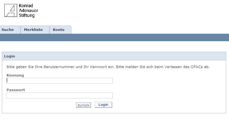 Dazu ist die Benutzernummer und das persönliche Kennwort notwendig. Diese Informationen können in der Bibliothek erfragt werden: Tel.: 02241 / 246-2204 oder zentrale-bibliothek@kas.de