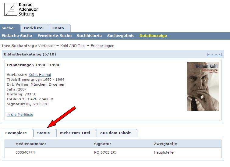 Screenshot - Einzeltrefferanzeige - Unterhalb der Literaturangaben in der Einzeltrefferanzeige ist u.a. die Karteikarte Status.