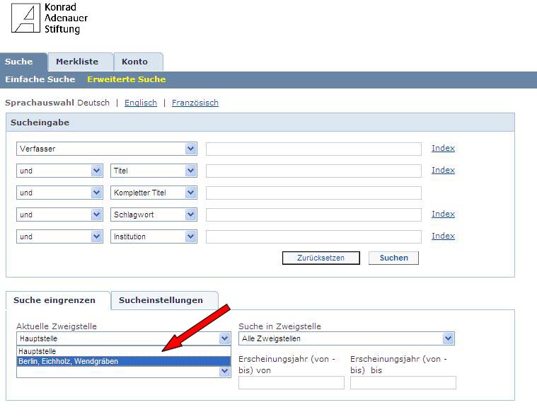 - In der Einfachen oder Erweiterten Suche ist unterhalb der Eingabeboxen die Karteikarte „Suche eingrenzen“. Dort im Feld „Aktuelle Zweigstelle:“ muß Berlin, Eichholz, Wendgräben als Standort ausgewählt werden.