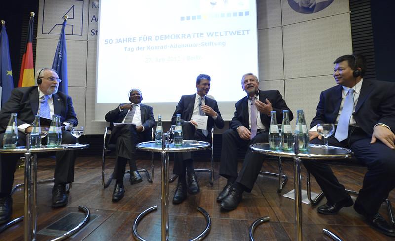 Doch auch in anderen Regionen ist die Arbeit für eine demokratische Entwicklung in vollem Gange. Einen Einblick dazu lieferten vier Partner, die zusammen die Podiumsdiskussion zum Thema „Demokraten unter Druck“ bestritten. Unter der Moderation von Christoph Lanz, Multimediadirektor der Deutschen Welle, berichteten Prof. Dr. Kyaw Yin Hlaing (Myanmar), Dr. Alexander Milinkiewitsch (Belarus), Dr. Willibrod Slaa (Tansania) und Ramón Guliiermo Aveledo (Venezuela) über die Situation in ihren Ländern und die Zusammenarbeit mit der Stiftung vor Ort.
