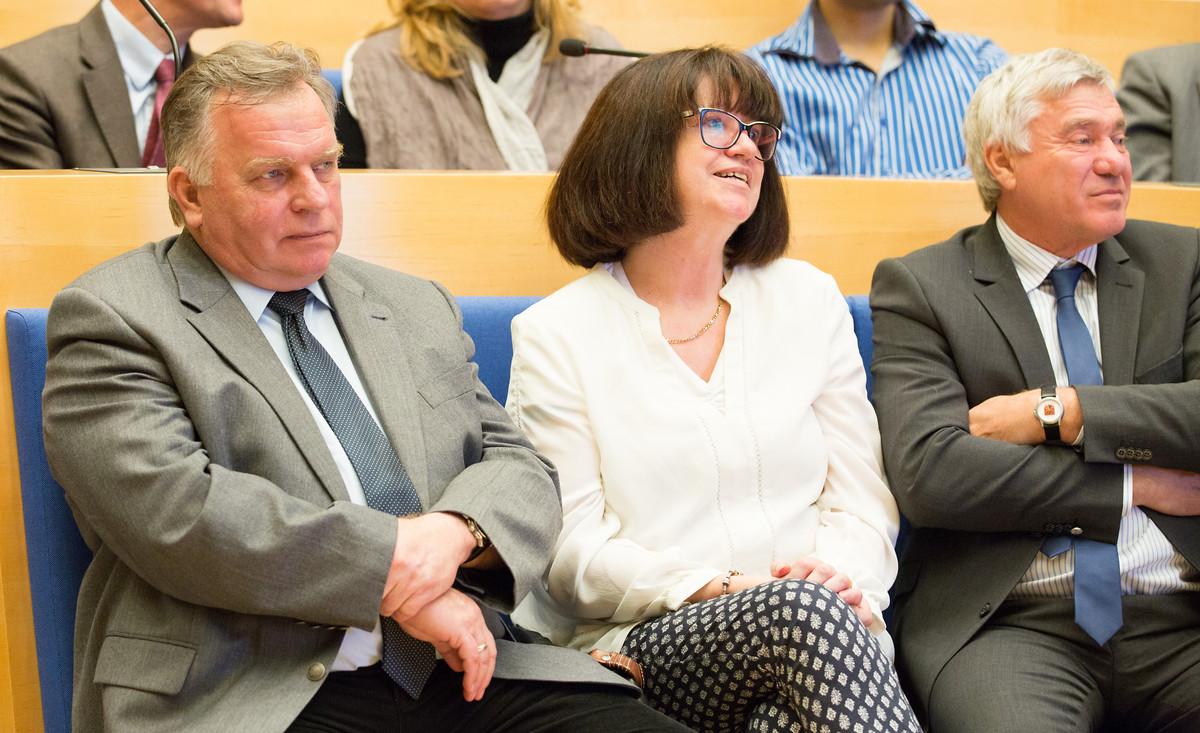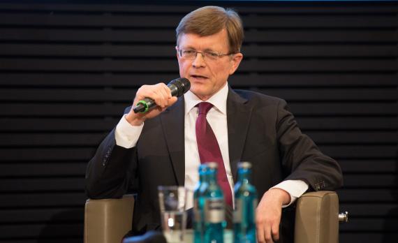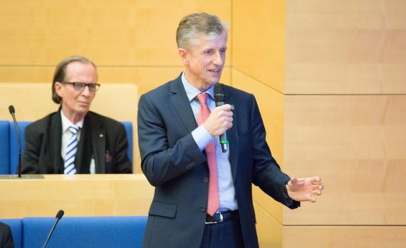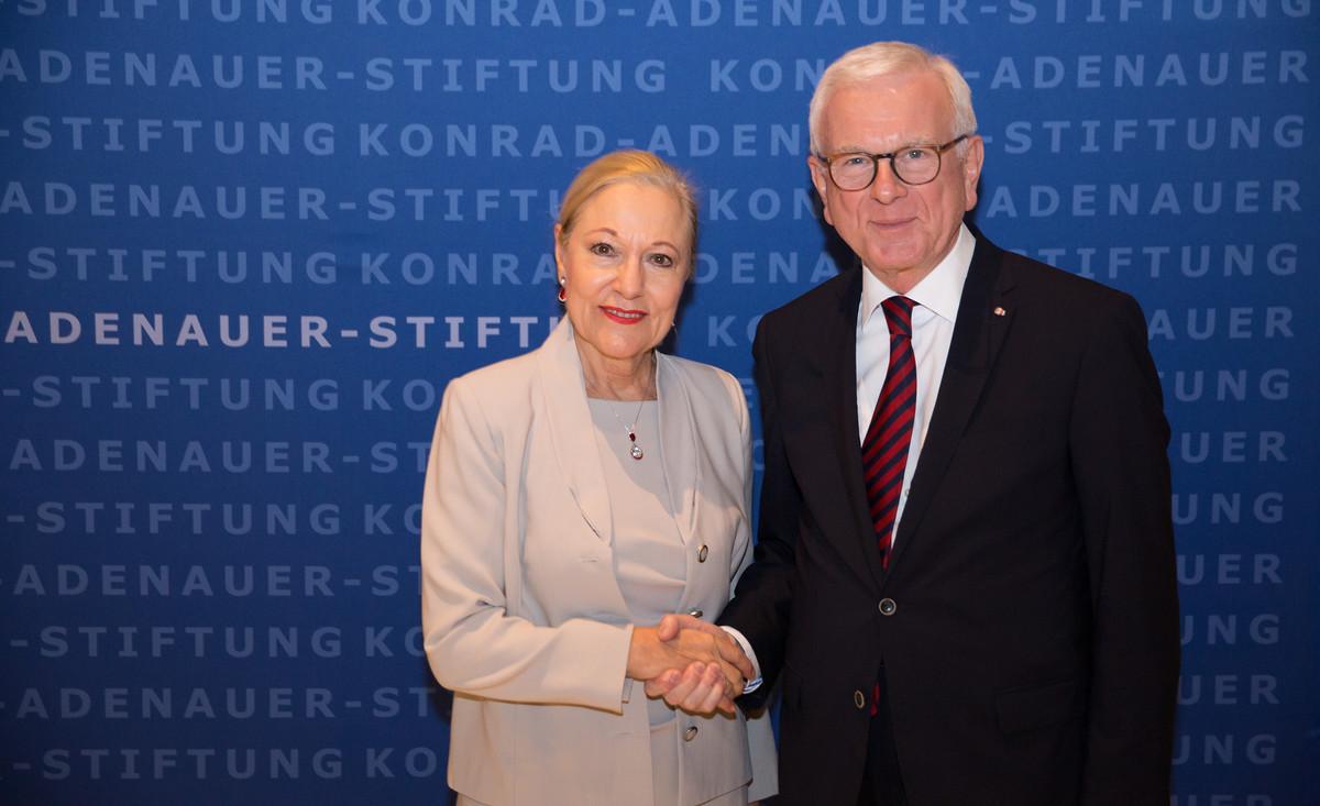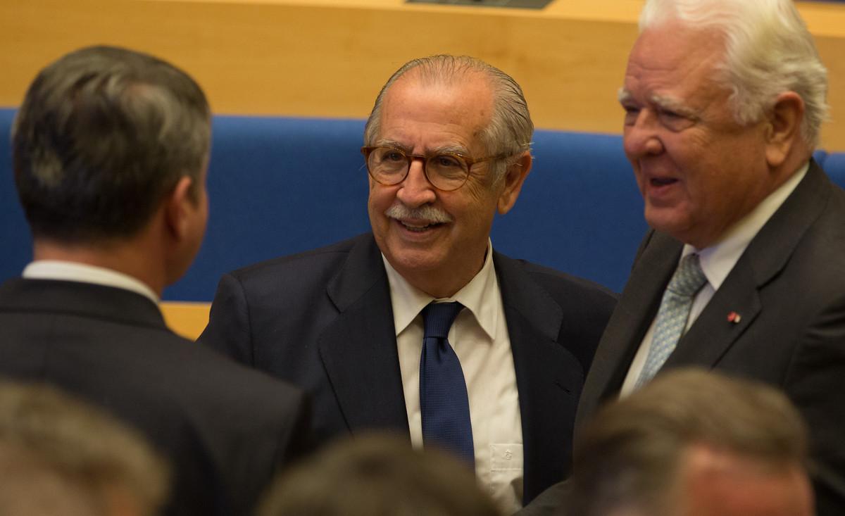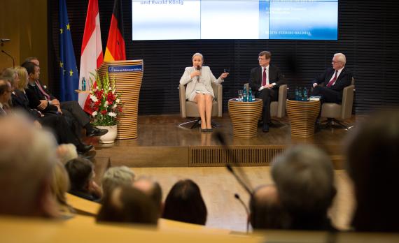 „Ein Radfahrer, der nicht tritt, fällt vom Rad“, fasst sie bildhaft die Situation Europas zusammen. Im Zeitalter der Globalisierung, neuer Technologien und wiedererstarkender Akteure habe die EU ebenfalls eine Reform-Kur nötig. Es brauche Wachstum für mehr Arbeitsplätze, die Fiskalunion biete Chancen für eine Sozialreform und ein Ausbau der Sicherheits- und Verteidigungsunion müsse fortgeführt werden. Darüber hinaus schlägt sie eine Entbürokratisierung der europäischen Institutionen vor. „Wir müssen beginnen, den internationalen Akteuren auf Augenhöhe zu begegnen.“ Mit Blick auf die aktuellen Herausforderungen der EU-Staaten erinnert Pöttering an den Zusammenhalt und die Verantwortung. „Unsere gemeinsamen Werte halten uns zusammen, denn wir leben in einer Wertegemeinschaft“, so der ehemalige Präsident des Europäischen Parlaments.