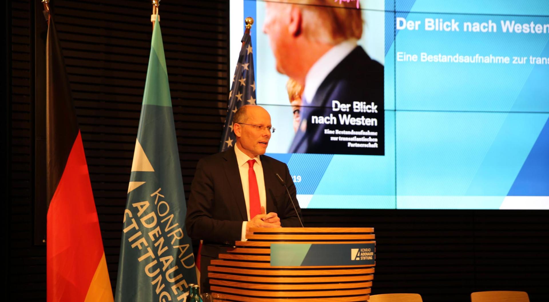 Der Bundestagsabgeordnete Peter Beyer, Koordinator der Bundesregierung für die transatlantischen Beziehungen, hat der transatlantischen Partnerschaft zwei Jahre nach Amtsantritt Trumps eine gemischte Bilanz ausgestellt. „In den Zielen liegen wir an sich gar nicht weit auseinander, aber den Weg zu ihrer Erreichung stellen wir uns unterschiedlich vor“, sagte Beyer im Rahmen einer Keynote-Rede bei der Veranstaltung „Der Blick nach Westen – Eine Bestandsaufnahme zur transatlantischen Partnerschaft“ in der KAS. Klar sei, dass die transatlantischen Beziehungen aus Sicht Deutschlands und Europas unersetzlich sind. Es komme insbesondere darauf an, für gegenseitiges Verständnis in den jeweiligen Debatten und Bevölkerungen zu werben. „Ich glaube fest an ein transatlantisches Fundament, das Schwierigkeiten aushält“, sagte Beyer. Man müsse mehr miteinander, denn übereinander sprechen.