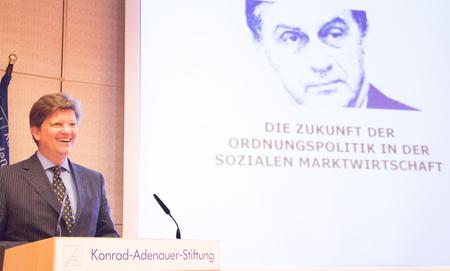 An den Kern der ordnungspolitischen Idee erinnerte der Staatsminister bei der Bundeskanzlerin Eckart von Klaeden. Er sagte: „Das Wesen der Ordnungspolitik ist es, bei allen Entscheidungen nicht den leichten, sondern den richtigen Weg zu gehen.“ Als Beispiel dafür, was geschehen kann, wenn dieses Prinzip missachtet wird, nannte er die Krise in Griechenland. Über Jahrzehnte sei hier gegen die Ordnungspolitik verstoßen worden. In der Konsequenz habe das Land seine Wettbewerbsfähigkeit verloren.