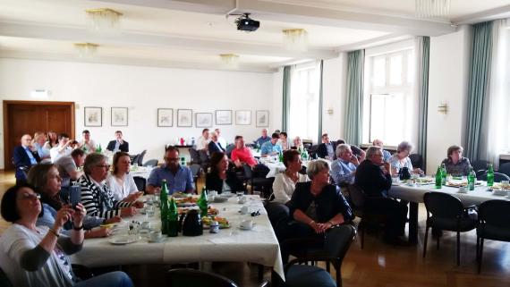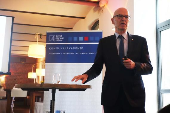 Thomas Krämer, Referent beim Landkreistag NRW, stellte eine Woche nach den Landtagswahlen und einen Tag vor Beginn der Koalitionsverhandlungen in Düsseldorf in seinem Vortrag v.a. die Themen Sicherheit und Ordnung, kommunale Finanzen, digitale Infrastruktur und Konsolidierung der Bildungslandschaft als Kernforderungen des Landkreistages in den Vordergrund. Dabei betonte er das Prinzip der Subsidiarität, demnach kommunale Aufgaben so ortsnah wie möglich und so fachnah wie nötig gelöst werden sollten. Zur Prävention und Kriminalitätsbekämpfung müsse die Polizeipräsenz im ländlichen Raum erhöht werden. Zur Sicherstellung solider kommunaler Finanzen setzte er sich für eine originäre Steuerbeteiligung der Kreise sowie eine sozialleistungsbezogene Umlage ein. Die Sozialkosten seien in den letzten Jahren ohne Gegenfinanzierung erheblich gestiegen. Ziel müsse die Erhöhung der Investitionspauschale statt weiterer Förderprogramme von Landesebene sein. Den Breitbandausbau bezeichnete er als konkrete Herausforderung, wobei insbesondere die Bildungseinrichtungen ans Netz gebracht werden müssten. Ebenso betonte er die Förderung kleinerer und mittlerer Unternehmen als Rückgrat der Wirtschaft und forderte die Flexibilisierung der gewerblichen Planung. Er warnte davor, in die Fläche zu planen und Museumsdörfer zu schaffen; fußläufige Nahversorgung sei wichtiger als Einkaufzentren am Rand der Gemeinde. Die Konsolidierung der Bildungslandschaft hob Krämer hervor, wobei er die Schließung von 200 Förderschulen infolge der Einführung der Inklusion in NRW kritisierte.