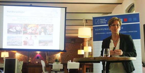 Der Landkreis Euskirchen zeigt beispielhaft, wie auch innerhalb eines ländlich geprägten Landkreises sowohl demografisch wie auch wirtschaftlich sehr unterschiedliche Herausforderungen zu bewältigen sind. Die Einwohnerdichte reicht von 44 Einwohnern/km² bis hin zu über 400 Einwohnern/km². Gleichzeitig ist die Ausgangslage u.a. mit Blick auf die Metropolregion Rheinland eine andere als in ländlichen Regionen ohne direkte Nähe zu Metropolen. Der ländliche Raum ist heterogen – politisch, geografisch, wirtschaftlich wie sozial – die politischen Antworten auf die jeweiligen Herausforderungen müssen es ebenso sein. Der Kreis Euskirchen hat in einer Demografieinitiative auf die zentralen demografischen Herausforderungen – weniger, bunter, älter – auf vielfältige und kreative Art reagiert: Iris Poth, Leiterin der Stabsstelle Struktur- und Wirtschaftsförderung und Demografiebeauftragte des Kreises Euskirchen sowie Geschäftsführerin der Nordeifel Tourismus GmbH ging auf einige von 50 seit 2011 entwickelten und umgesetzten Projektbeispiele aus den Handlungsfeldern Bildung, Integration und Inklusion, Kinder-, Jugend- und Familienfreundlichkeit, Wirtschaft und Arbeit, Lebensqualität und Infrastruktur sowie Verständnis zwischen den Generationen ein und betonte dabei das ehrenamtliche Engagement. Eindrücklich zeigten die vielfältigen Projektideen wie beispielsweise Sprachpatenprojekte, Aktionswoche der Generationen, Quartiersmanagement, kommunale Zukunftswerkstätte sowie Familienkarte oder Aktionen zur Fachkräftegewinnung eindrücklich, dass Schrumpfung Innovationen fördern und der demografische Wandel auch Chance sein kann. Der Kreis habe mit der Weiterentwicklung des Tourismuskonzepts und durch den Nationalpark Nordeifel seine Stärken als Naherholungs-, Urlaubs- und Erlebnisregion erfolgreich ausgebaut, so Poth: 2015 habe der Wirtschaftsfaktor Tourismus durch einen regelrechten Boom 265 Millionen Euro Bruttowertschöpfung ausgemacht, Tendenz steigend.