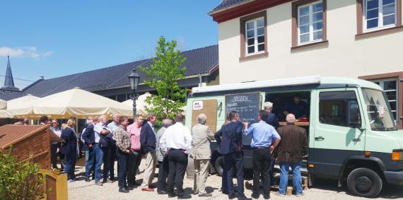 Chefkoch Oliver Röder lud mittags zum Imbiss aus dem Food Truck ein. Der Jungunternehmer und Sternekoch erinnerte sich an seine Anfangszeit auf der Burg Landlust. Freunde hätten ihn für verrückt erklärt, als es den Niedersachsen in den kleinen Eifelort zog, um diese Region kulinarisch zu vermarkten. Das Konzept ist aufgegangen. Nicht nur das Eifel-Gourmetfestival, das er gemeinsam mit Jungunternehmer Johannes von Bemberg jährlich veranstaltet, zeigt, dass auch vermeidlich verrückte Initiativen vom Land zum Standortfaktor werden können.