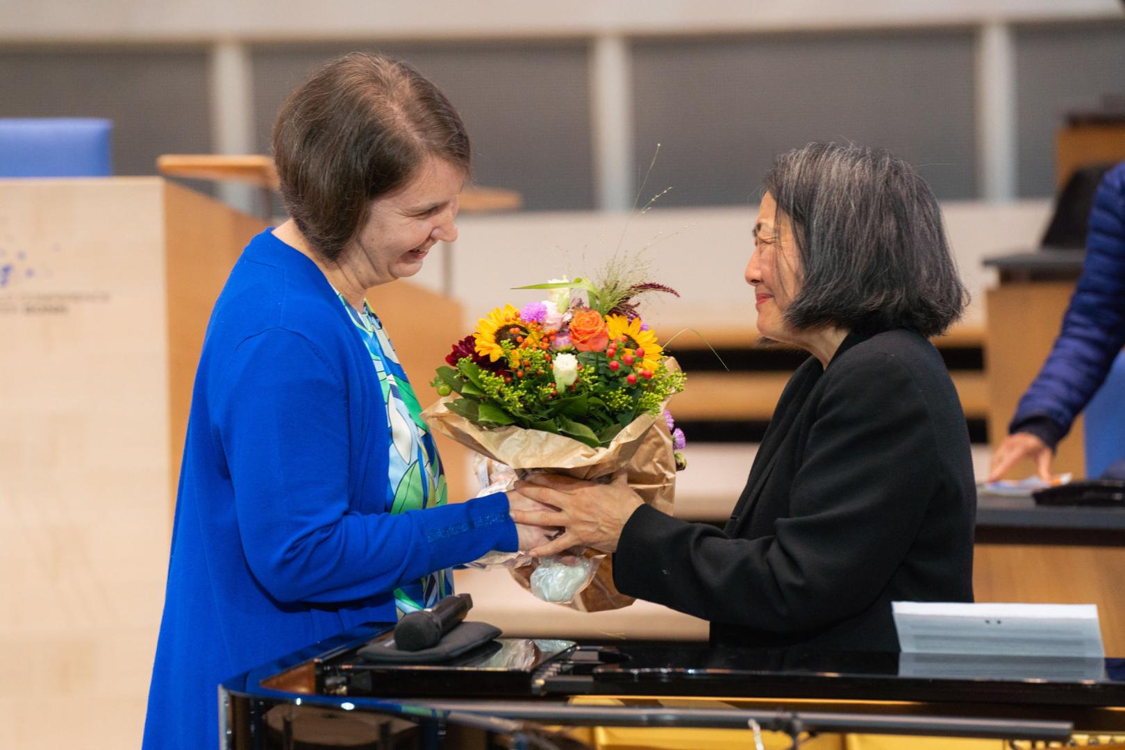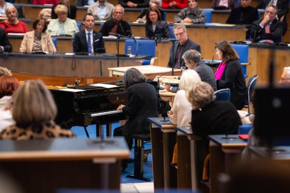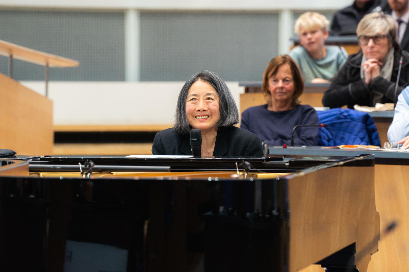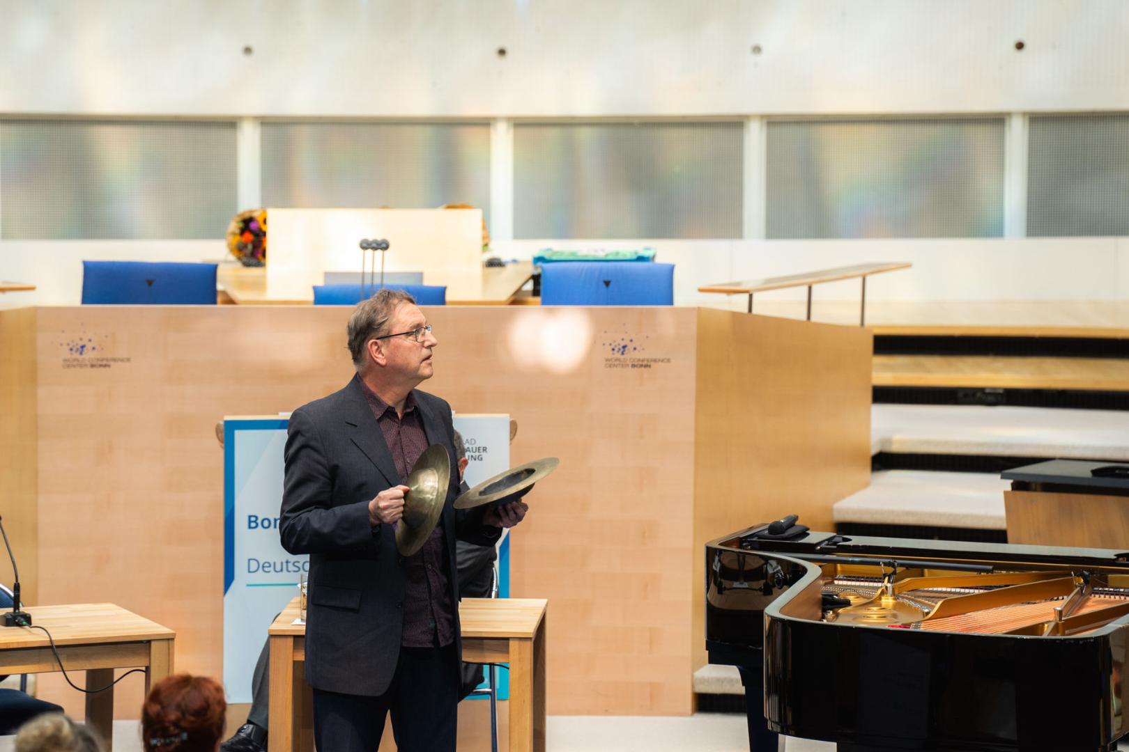 Was folgte, war eine Novität: Keine Abfolge von Ansprachen, sondern eine Collage aus Texten, Musik und Klängen. Die Texte kamen aus Reden und Romanen von Navid Kermani, gelesen von ihm selbst und von Eva Mattes. Die Musik von Schubert, Beethoven und Schönberg wurde von der Pianistin Pi-hsien Chen vorgetragen, ihr Ehemann Manos Tsangaris überraschte das harmonieverwöhnte Publikum mit neuartigen, anspruchsvollen Perkussionsklängen. Musik und Klänge unterstrichen dabei die Art und Weise, wie Navid Kermani Deutschland empfindet.