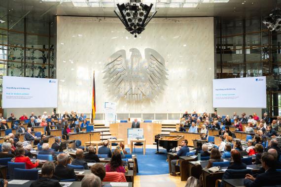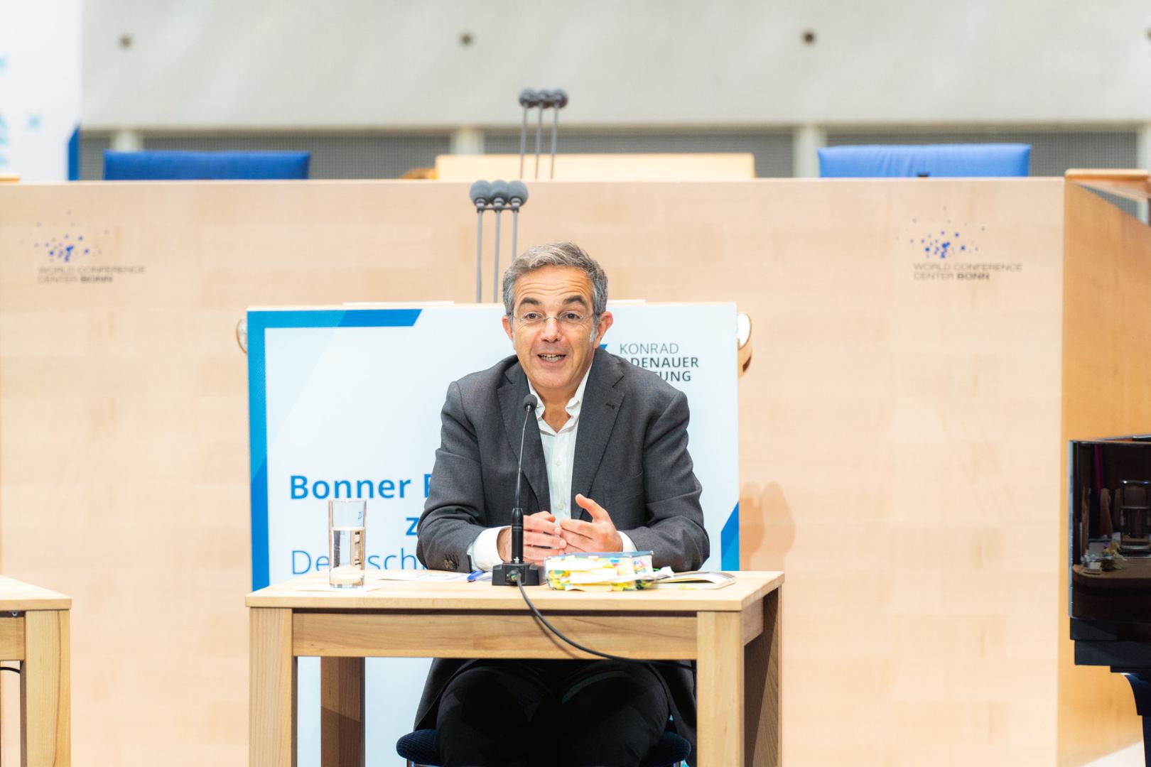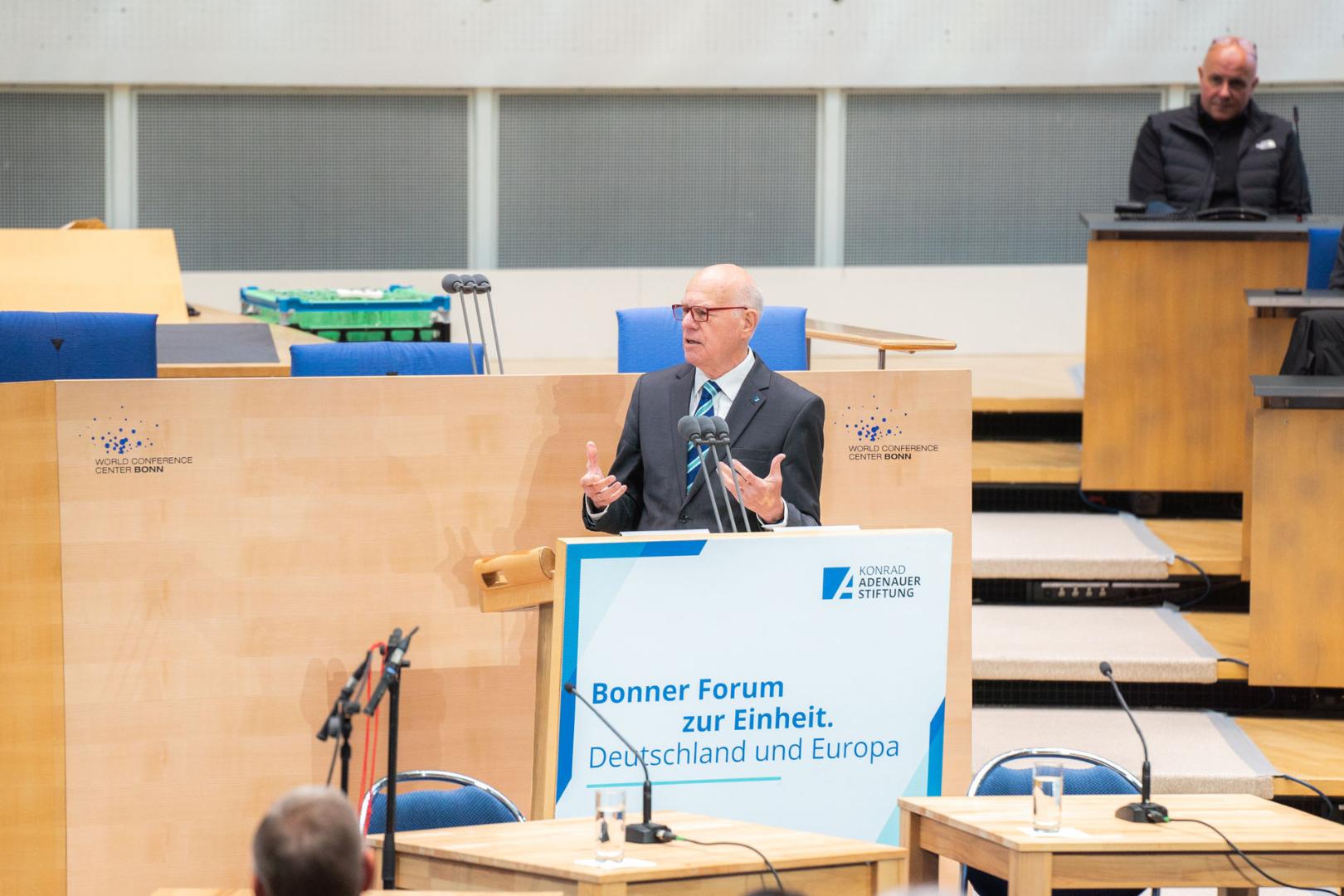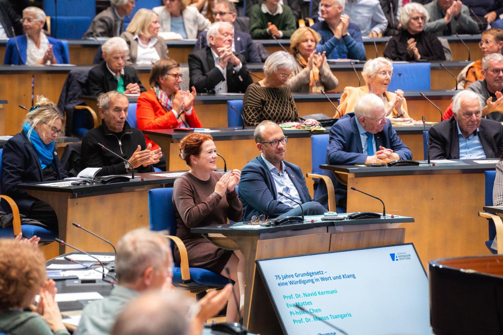 Es ging um 75 Jahre Grundgesetz und wurde eine Meditation über Deutschland. Norbert Lammert, Vorsitzender der Konrad-Adenauer-Stiftung und Präsident des Deutschen Bundestages a.D., erinnerte zunächst an die Erfolgsgeschichte des Grundgesetzes: Es ist die erste Verfassung der Deutschen, die Nationalstaatlichkeit und Demokratie in eine politisch nachhaltige und belastbare Form zusammengebracht hat. Bundesrepublik und Grundgesetz währen nun länger als alle drei vereinigten Deutschlands seit 1871, aber! Das „Aber“ folgte unweigerlich danach: Denn, so Lammert, alle politischen Systeme sind sterblich, nicht nur die schlechten, die falschen. Auch gut angelegte Demokratien können zugrunde gehen, auf ihre Weise, nämlich durch Wahlen. In der Wahlkabine, nicht auf den Barrikaden, entscheide sich das Schicksal der Demokratie, und durch die Fähigkeit der Politiker, Lösungen für bestehende Problemlagen zu finden.