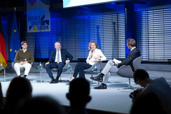 Welches Narrativ Europa zukünftig tragen könne, war eine Frage, die Moderator Dr. Christian Johann in der Podiumsdiskussion stellte. Die Gegner von Europa versuchten es mit einem emotionalen Storytelling kaputt zu machen, antwortete Mathis Sieglerschmidt für die junge Generation: „Warum versuchen wir nicht mit einem emotionalen Storytelling Europa aufzubauen?“ Prof. Dr. Daniela Schwarzer, Vorständin der Bertelsmann Stiftung, stellte den Freiheitsbegriff ins Zentrum und knüpfte damit an das Leitmotiv des Abends an: „Das, was uns von denen unterscheidet, die uns bedrohen, ist, dass wir ein Kontinent sind, auf dem individuelle Freiheit, wirtschaftliche Freiheit, Wissenschaftsfreiheit und Kunstfreiheit garantiert sind.“ Europa müsse darüber hinaus „endlich die Rahmenbedingungen schaffen, von denen wir wissen, dass wir sie brauchen“. Dies umfasse die Vollendung des Binnenmarkts, die Kapitalmarktunion und die Digitalisierung. „Die Pläne dafür liegen seit Jahren in den Schubladen“, betonte Schwarzer. Manfred Weber schloss mit den Worten: „Wenn wir auf dieses Europa blicken, wird jede Generation vor der Aufgabe stehen, dieses Projekt wieder selbst zu erkämpfen und zu erdenken.“ Dafür müssten die Vorteile Europas immer wieder klar herausgestellt werden.