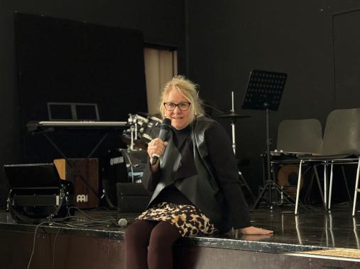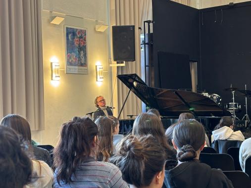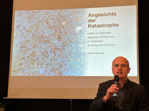 Dreizehn Gedichte hat der Bingener Künstler Gernot Blume vertont, sie sind historische Zeugnisse, vom Holocaust, von Krieg, Vertreibung und Emigration. Sie eröffnen den Schülerinnen und Schülern an diesem Vormittag des 20. März eine andere Art, sich mit der Geschichte des Zweiten Weltkriegs und dem massenhaften Mord an Jüdinnen und Juden zu beschäftigen. Mit den Mitteln der Kunst soll gelingen, was seit jeher eine zentrale Aufgabe politische Bildungsarbeit ist: die unbegreiflichen Gräuel des Holocaust fassbar zu machen.