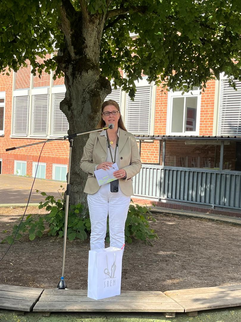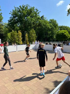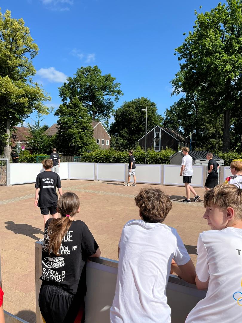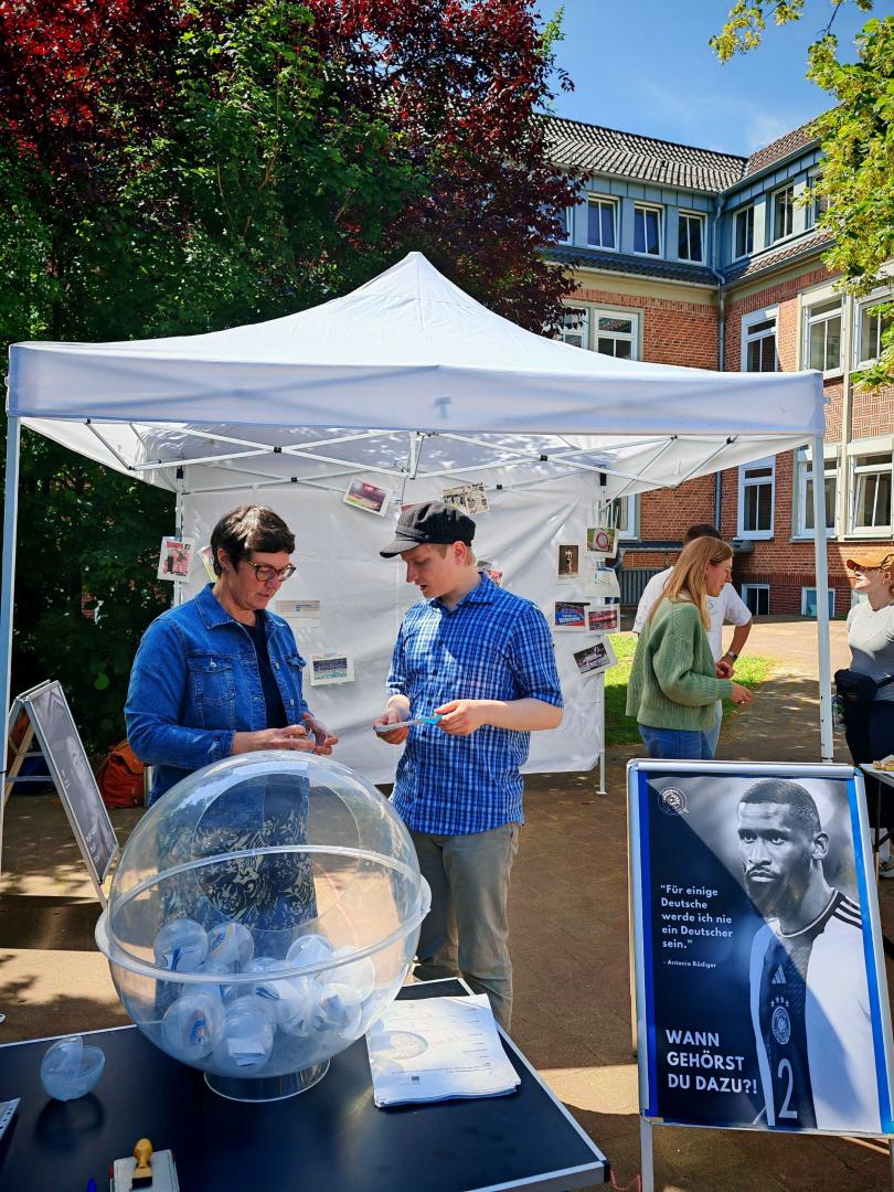 Der Abschluss der Projektwoche fand auf dem Schulhof des Christian Gymnasiums in Hermannsburg statt. Nach einem kleinen Grußwort der Bergener Bürgermeisterin Claudia Dettmar-Müller erhielten die Schülerinnen und Schülern sowie deren Lehrkräfte eine Urkunde über ihre Teilnahme an den Anne-Frank-Friedentage 2025 überreicht. Der letzte Projekttag stand dann ganz im Namen des fairen Sports ohne Diskriminierung. Auf zwei Soccer-Courts trugen kleine Teams der Teilnehmerinnen und Teilnehmer gemeinsam mit Schülerinnen und Schülern des Gymnasiums ein kleines Turnier aus und bemühten sich dabei sportlich um den Sieg. In einem kleinen Pavillon konnten sich Interessierte parallel – insbesondere die Schülerinnen und Schüler des Gymnasiums – noch tiefer dem Thema „Diskriminierung im Sport“ widmen und dabei an mehreren Stationen Punkte verdienen. Als das Turnier gegen Mittag endete, wurden die Sieger des Fußallturniers aber auch diejenigen, welche alle Stationen im Pavillon erfolgreich abschlossen, geehrt. Nach einem gemeinsamen Mittagessen und einer kleinen Reflexionsrunde ging die volle Projektwoche zu Ende.