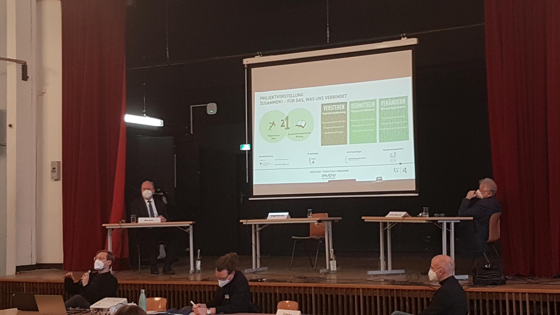 Nach Begrüßung, inhaltlicher Einführung und Vorstellung der Referenten durch Schulleiter Gerrit Ulmke bzw. Veranstaltungsleiter Felix Kraft, begann Luis Engelhardt, Leiter des Präventionsprojekts „Zusammen1“ bei Makkabi Deutschland e.V., den 94 Schülerinnen und Schülern der vier 10. Klassen die gesellschaftliche Ausnahmerolle Makkabi Deutschlands sowie den Unterschied zu anderen Vereinen zu erklären.