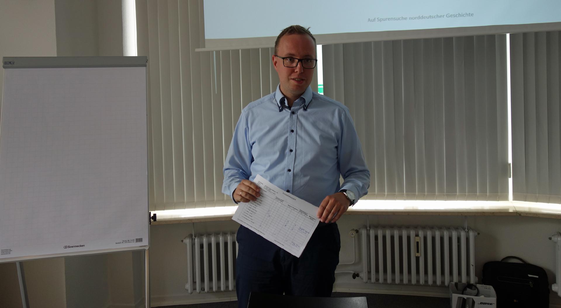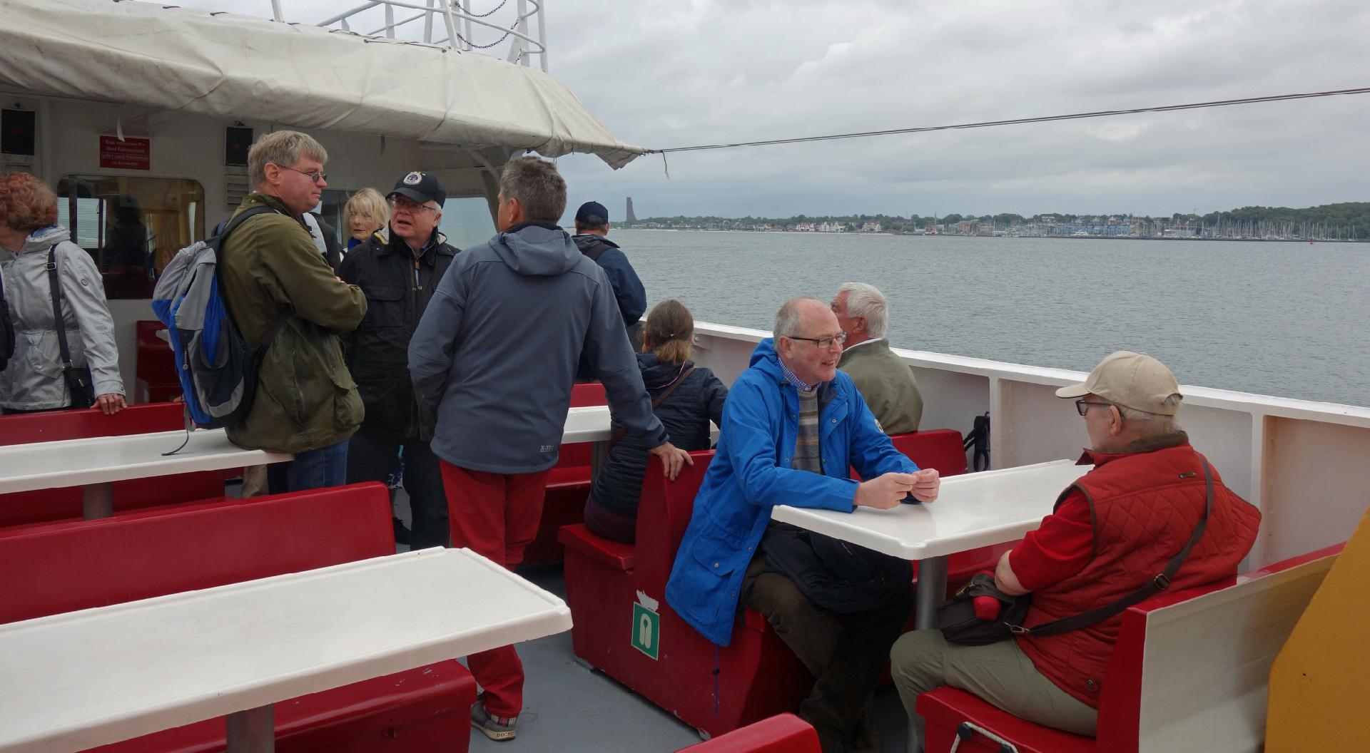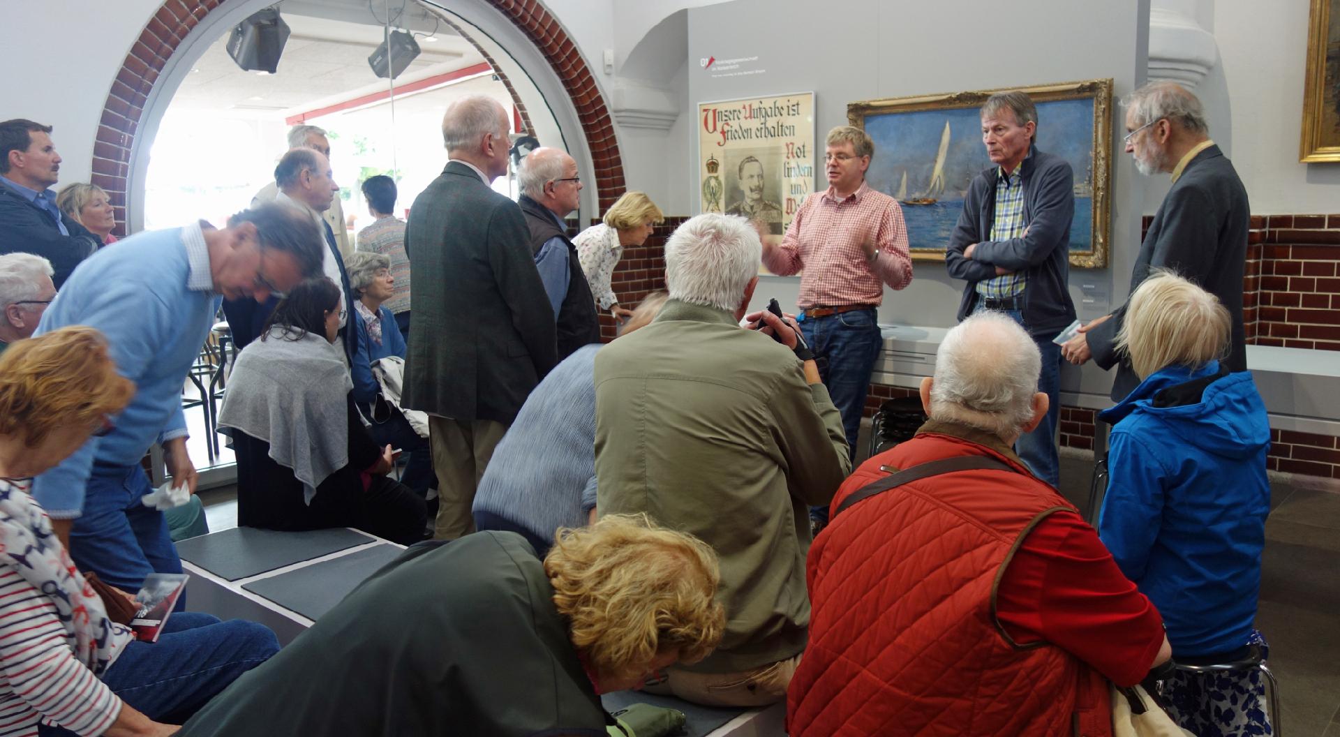 Am 4. Juli startete Rackwitz den Exkursionstag beim Kieler Landtag. Nach einer Einführung zur Geschichte des Landtages und der Bedeutung Kiels für den Schiffsbau und die Marine ging es mit dem Fördedampfer nach Laboe, wo es eine Führung durch das Marine-Ehrenmal gab. Anschließend konnte man noch durch das U-Boot 995 klettern und die Enge eines U-Bootes des 2. Weltkrieges erleben. Nach einer Stärkung und der Rückfahrt zur Reventloubrücke führte Rackwitz durch die Sonderausstellung „Die Stunde der Matrosen. Kiel und die deutsche Revolution 1918“ im Kieler Schifffahrts-Museum. Der Tag endete mit dem Besuch von Originalschauplätzen des Matrosenaufstands: „Breuste-Denkmal“ für die Kieler Matrosen im Ratsdiener-Garten, der Ort der Schießerei vom 3.11.1918 und Überreste der Marinearrestanstalt – beides in der Feldstraße – sowie die ehemalige Marinestation der Ostsee (Lornsenstraße/Adolfstraße). Zum Nachdenken brachte alle, dass das Finanzamt, das sich heute in der früheren Marinestation befindet, es abgelehnt hat, die kleine Wanderausstellung des Landes Schleswig-Holstein zum Matrosenaufstand 1918 in seinen renovierten Räumlichkeiten dauerhaft aufzustellen.
