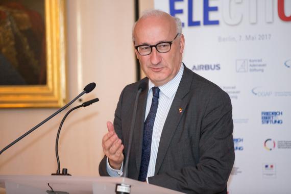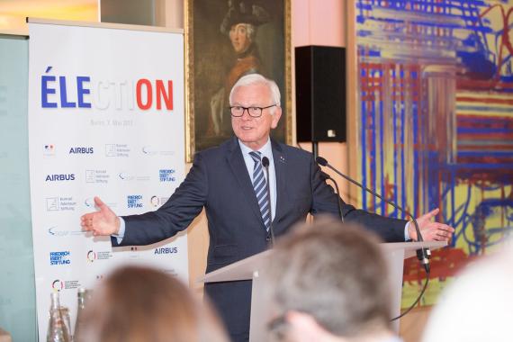 Für Gastgeber Phillip Etienne, seit 2014 Botschafter der Republik Frankreich in Deutschland, ist der Wahlabend kein gewöhnlicher Sonntagabend. Während in der oberen Etage die Diskussionsveranstaltung beginnt, geben im Erdgeschoss der Botschaft Hunderte in Berlin lebende Franzosen noch ihre Stimme ab. Die heutige Stichwahl sei nicht nur ein wichtiger Moment in der Geschichte der französischen Demokratie, sagt Etienne. „Der Ausgang dieser Wahl ist entscheidend für ganz Europa“, so der Botschafter in seiner Eröffnungsrede. Dr. Hans-Gert Pöttering, ehemaliger Präsident des Europäischen Parlaments und Vorsitzender der Konrad-Adenauer-Stiftung, betont, dass große Herausforderungen vor dem Gewinner dieser Stichwahl liegen. Nicht nur die Regierungsbildung werde aufgrund der zerstrittenen politischen Lager kein leichtes Unterfangen. Die gesamte französische Gesellschaft sei derzeit tief gespalten. Emmanuel Macron sei jedoch laut Pöttering in der Lage, diesen schwierigen Weg mit „Leidenschaft und Geduld“ zu bestreiten.
