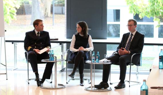Im Anschluss diskutierten Sebastian Hoffmeister aus dem Bundesministerium des Innern mit Fregattenkapitän Dr. Patrick Jungkunz aus dem Bundesministerium der Verteidigung. Moderiert wurde die Diskussion von Juliane Kabus, Policy Advisor bei der Münchner Sicherheitskonferenz. Hoffmeister erklärte eingangs wie die verschiedenen Initiativen und Behörden der Bundesregierung agieren. Initiativen und Behörden wie das BSI, ZITIs und das Cyberabwehrzentrum sollen die Expertise der Behörden aufbauen und damit zum Schutz der Bürger und Schutz deren kritischer Infrastruktur beitragen. Besondere Herausforderungen bestehen in der Koordination der verschiedenen Behörden und Ministerien wenn es um Fragen der Cyberabwehr geht. Hierbei waren sich die Panelisten einig, dass politisch mehr getan werden muss, um klare Kompetenzen und Zuständigkeiten festzulegen und um effektives Handeln zu gewährleisten.