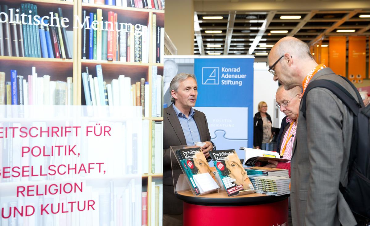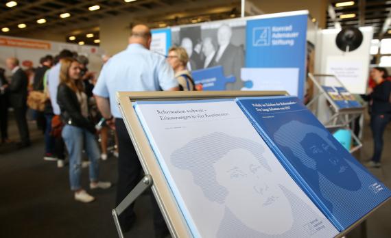 Auch auf dem Stand der Konrad-Adenauer-Stiftung auf dem Markt der Möglichkeiten in der Messe Berlin wurde über die Bedeutung Luthers für heutige politische Zusammenhänge diskutiert. Welche Verbindungen lassen sich zwischen dem Reformator der Frühen Neuzeit und den Diskussionen des 21. Jahrhunderts herstellen? Erstaunlich viele, aber die Bezüge sind nicht immer eindeutig und schon gar nicht immer gradlinig. Oft setzen sich Gedanken der Reformatoren des 16. und 17. Jahrhunderts erst nach kriegerischen Auseinandersetzungen, politischen Einigungsversuchen und philosophisch-theologischen Debatten durch.