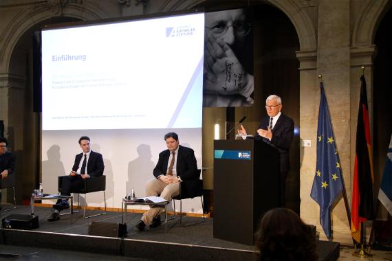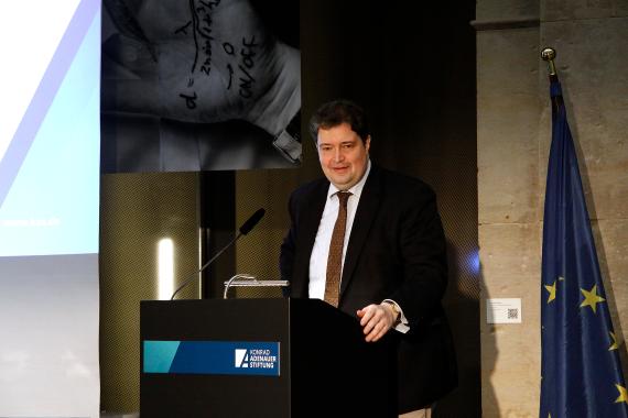 In seiner Begrüßung ging Dr. Hans-Gert Pöttering, Präsident des Europäischen Parlaments a.D. und Europabeauftragter der Konrad-Adenauer-Stiftung, auf die Pentarchie der Großmächte zu Beginn des 19. Jahrhunderts ein, deren Wesenszug – mit Golo Mann gesprochen – die Feindschaft aller Großmächte untereinander gewesen sei. Der Versuch, mittels einer Politik des Gleichgewichts Kriege zu verhindern, sei gescheitert. Die Gründerväter der europäischen Einigung wie Konrad Adenauer, Alcide de Gasperi und Robert Schuman zogen die Konsequenzen aus Nationalismus und Krieg. Statt auf das Gleichgewicht der Mächte setzten sie auf den gemeinsamen Prozess der europäischen Integration mit dem Aufbau supranationaler Strukturen. Die Europäische Union sei eine Rechtsgemeinschaft, die sich auch bei den aktuellen Debatten über die Bewältigung der Pandemie und den EU-Haushalt bewähren müsse. „Das Recht“, so betonte Pöttering abschließend, „sichert den Frieden.“