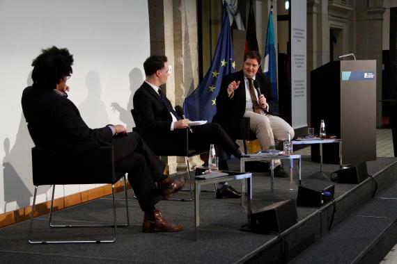 Am Beispiel des französischen Staatspräsidenten Charles de Gaulle (1958-1969) wurden die Wirkmächtigkeit und Langlebigkeit nationalstaatlichen Denkens im 19./20. Jahrhundert diskutiert, das die historische Forschung heute generell als ideengeschichtliche Konstruktion ansieht. In diesem Zusammenhang machte der Literaturkritiker und Publizist Ijoma Mangold, stellv. Leiter des Feuilletons der ZEIT, jedoch darauf aufmerksam, dass das Wissen um die Konstruiertheit von Ideen diesen nicht ihre gedankliche Bindekraft in Vergangenheit und Gegenwart nähme, was bei der Bewertung ihrer Bedeutung berücksichtigt werden müsse. Bei der Zukunftsfähigkeit des Begriff des „Westens“ als gemeinsame Klammer zwischen Europa und den USA gaben sich die Teilnehmer mit Blick auf die Entfremdung der letzten Jahre eher skeptisch. Europa müsse bei den aktuellen Herausforderungen primär seine eigene Zukunftsfähigkeit und Innovationskraft beweisen. Aktuell habe Europa leider ein „Zukunftsvertrauensproblem“, konstatierte Mangold. Oppermann beschloss die Diskussion mit einem Zitat des französischen Intellektuellen Raymond Aron: „Ich hätte mir gewünscht, dass das vereinte Europa Monnets […] möglich gewesen wäre. Ich glaubte aber nicht sehr daran. […] Aber ich wünschte mir leidenschaftlich die Versöhnung mit Deutschland und eine enge Zusammenarbeit. Und im Grunde hat man wahrscheinlich das erreicht, was möglich war und was heute Realität für die jungen Franzosen, die jungen Deutschen ist: Sie gehören derselben zivilisatorischen Einheit an. Die Grenzen haben keine große Bedeutung mehr. Das ist schon viel. Es ist nicht das, wovon Monnet träumte. Es liegt näher bei dem, was General de Gaulle sich vorstellte. Es war das historisch Wahrscheinliche.“ Alle Teilnehmer stimmten der Grundaussage Arons zu und hoben hervor, dass der Weg der europäischen Integration ebenso pragmatisch fortgesetzt werden müsse, wie er in den 1950er Jahren begonnen worden sei.