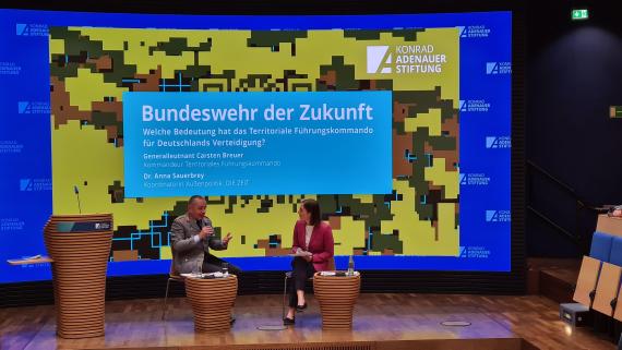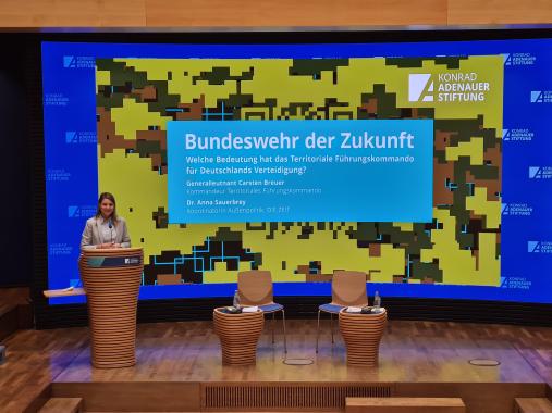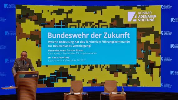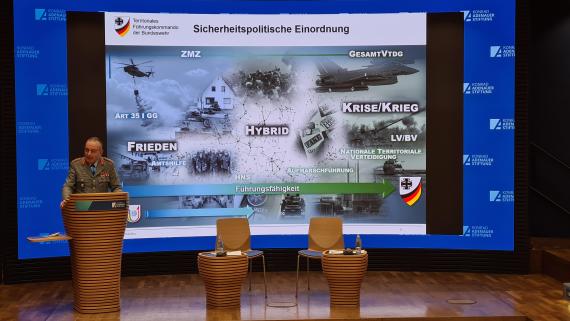 Generalleutnant Carsten Breuer erläuterte zunächst die Verortung des Kommandos: Es nimmt seinen Dienst im universellen Lagespektrum zwischen „Frieden, Krise, Krieg“ wahr. Grundsätzlich soll es die Führungsrolle für alle in Deutschland befindlichen Soldatinnen und Soldaten übernehmen. Die Bundesrepublik muss eine nationale Führungsfähigkeit aufbauen, um im Notfall autonom handlungsfähig zu sein. Sicherheit wurde, so der General, lange Zeit in der Gesellschaft outgesourced, müsse nun aber wieder in Gesellschaft und Politik als zentrales Element wahrgenommen werden. Eine große Herausforderung beim Aufbau des Kommandos stelle die Gewährleistung der Einsatzbereitschaft dar. Angesichts der aktuellen Bedrohungslage durch den russischen Angriffskrieg sei es wichtig, entsprechende Strukturen aufzubauen. Zudem kämen neben der Amtshilfe auch hybride Bedrohungen hinzu, deren Ziel es auch sei, gesellschaftliche Unsicherheit zu erzeugen. Die Amtshilfe dürfe aber immer nur als Option beansprucht werden und müsse immer auf Grundlage des Grundgesetzes erfolgen. Das Territoriale Führungskommando bereitet sich gegen hybride Bedrohungen mithilfe von szenariobasierten Übungen vor. Diese Form der Bedrohungen werden stets subjektiv wahrgenommen. Das wirksamste Mittel gegen die Hybridität sei Resilienz. Seit dem 24. Februar 2022 lässt sich eine veränderte gesellschaftliche Sensibilität für derartige Bedrohungen beobachten.