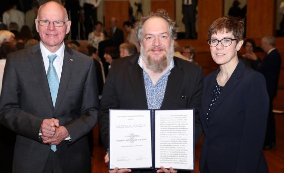 Mit der symbolischen Reise des Protagonisten in „Kompass“, wofür Énard bereits in Frankreich 2015 den Prix Goncourt-Preis erhielt, werde die Frage gestellt, ob das Tor zum Orient von beiden Seiten durchschritten werden wolle. Der aktuelle Bezug sei unverkennbar, erläuterte Kramp-Karrenbauer, und lobte die zentrale Botschaft seines Romans. „Anstatt auf die Kleinmütigen und Engherzigen zu hören, die Feindschaft und Ängste vor dem anderen, den Austausch und der Migration schüren, kann eine Annäherung und friedliches Zusammenleben eben nur über den mühsamen Weg des Dialogs gelingen“, sagte Kramp-Karrenbauer. Dazu gehörten auch verbindliche Absprachen und gemeinsame Werte als zentrale Elemente. „Auf all diese Beobachtungen gibt 'Kompass' keine unmittelbare Antwort, aber der Roman macht bewusst und lässt Tendenzen erkennen“, lobte die CDU-Generalsekretärin den diesjährigen Preisträger.