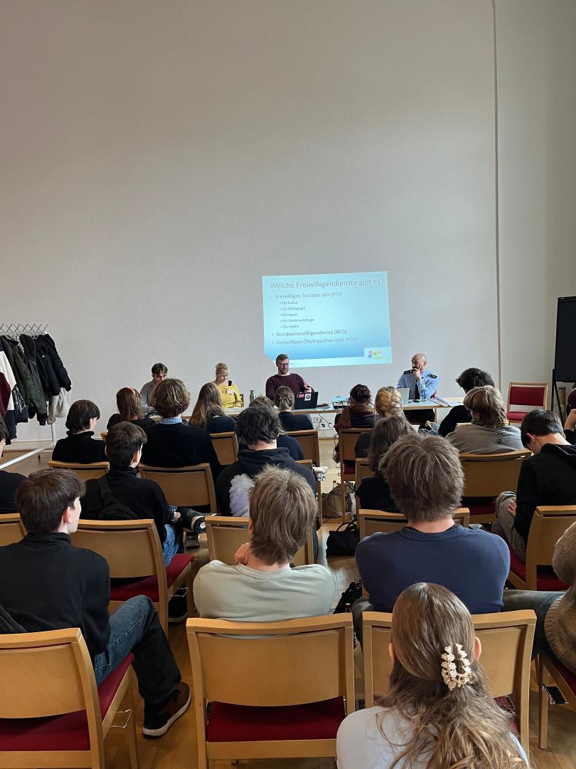 Im Workshop „Dienst an der Gemeinschaft – Diskussion zur Dienstpflicht“ wurde eine Debatte geführt, die für die anwesenden Jugendlichen von brennender Bedeutung ist. Unter der Moderation von Stephan Hoberg (Konrad-Adenauer-Stiftung e. V.) wurden gemeinsam mit Hauptmann Franz Conrad (Jugendoffizier Dresden), Robinson Dörfel (Sächsische Jugendstiftung) und der Schülerin Hedi Götze (Stadtschülerrat) zunächst die Voraussetzungen für den anschließenden Austausch geschaffen. Dabei erläuterte Hauptmann Conrad die strategischen Hintergründe der neuen Dienstpflicht, wie etwa die potenzielle Bedrohung durch Russland und regte einen Dialog an, in dem die Schülerinnen und Schüler gemeinsam über die Ursachen, Notwendigkeiten und Probleme dieser Entwicklung reflektierten. Als wichtige Alternative und Ergänzung stellte Robinson Dörfel zudem die vielfältigen Möglichkeiten eines Freiwilligen Sozialen Jahres (FSJ) vor.