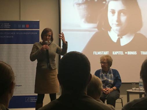 Am 28.01.2017 fand in Zusammenarbeit mit dem Erinnerungsort „Topf & Söhne- Die Ofenbauer von Auschwitz“ eine Filmvorführung mit anschließendem Gespräch mit der Auschwitz- Überlebenden Eva Schloss statt. Michael Panse, Erfurter Stadtrat und Schirmherr des „Denktags“ begrüßte die Gäste.