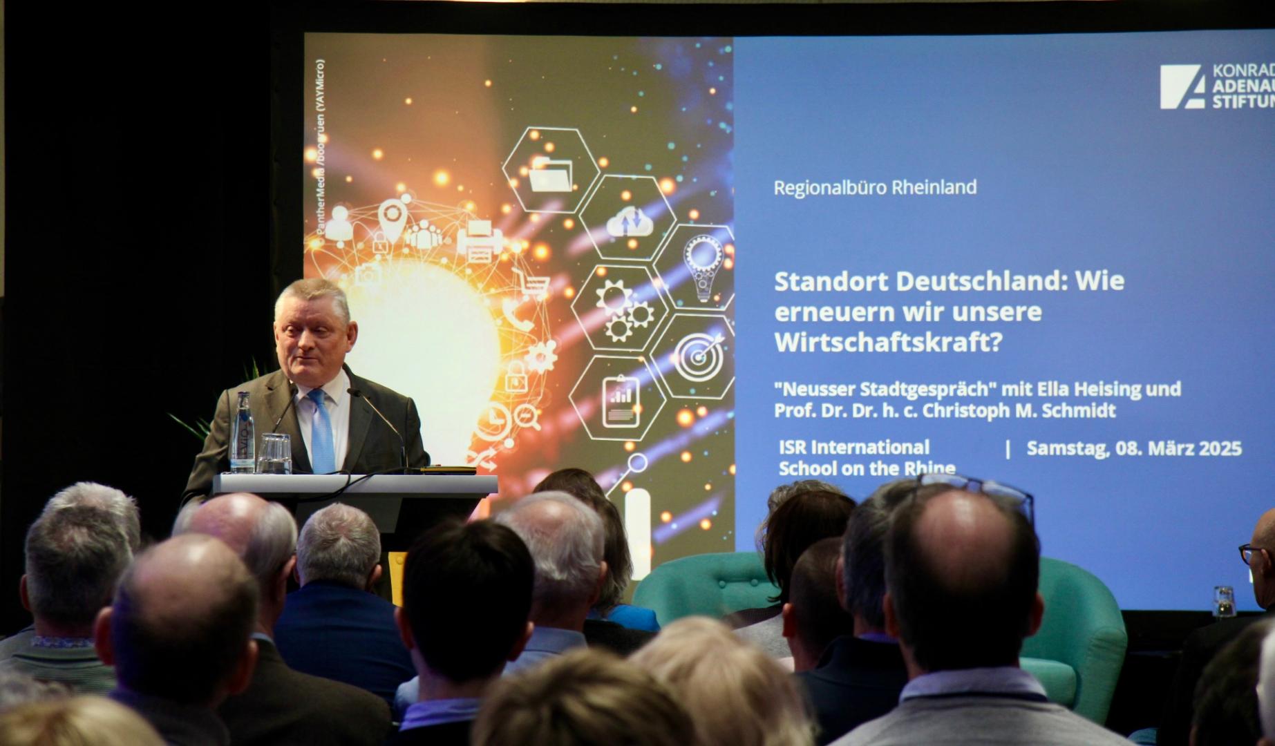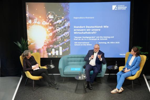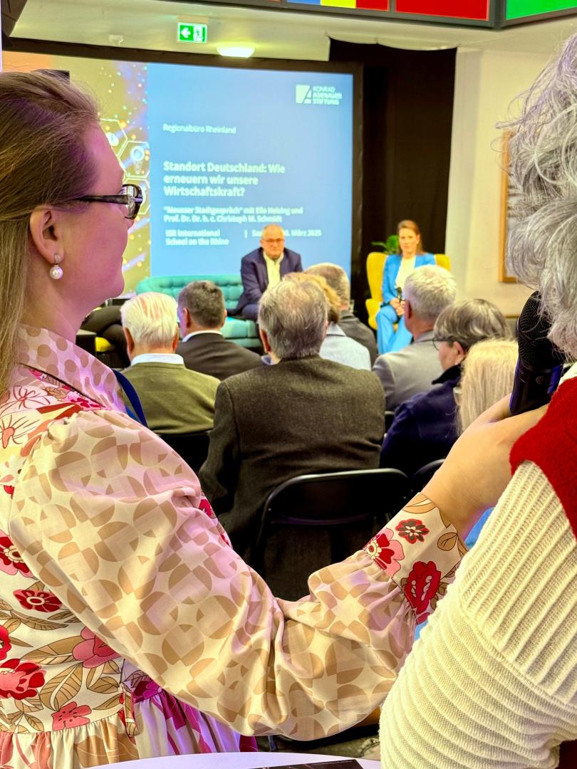 Gemeinsam mit dem Präsidenten des RWI – Leibniz-Instituts und KAS-Fellow 2025 Prof. Dr. Dr. h. c. Christoph M. Schmidt und Ella Heising, Geschäftsführerin des TechHubs.K67 haben wir darüber gesprochen, wie wir die Wirtschaftskraft in Deutschland erneuern können.