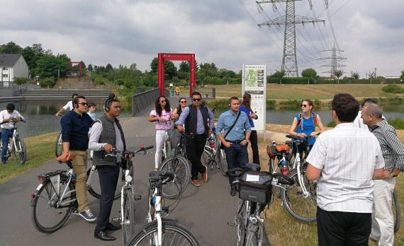 In der Stadt Essen gab es neben der Führung „Kohle und Kumpel“ in der Zeche Zollverein ein Treffen mit MdL Fabian Schrumpf und dem Kreisvorsitzenden der Jungen Union Nils Sotmann. Abschließend lud der Oberbürgermeister der Stadt Essen Thomas Kufen zu einem politischen Empfang ein. Nach Essen gelangten die Teilnehmer aus Mittelamerika mit dem Fahrrad auf dem ersten Radschnellweg Deutschlands (RS1). Dabei gab es bei Zwischenstationen sachkundige Erklärungen durch Christian Weirich vom Team Mobilität beim Regionalverband Ruhr. Dieser Programmteil wurde von den Teilnehmern nicht nur als willkommene und spaßige Auflockerung i.R. des dichten politischen Programms, sondern auch zur Erörterung konkreter Fragen und der Eruierung von Übertragungsmöglichkeiten auf Verdichtungsräume in den eigenen Ländern wahrgenommen.