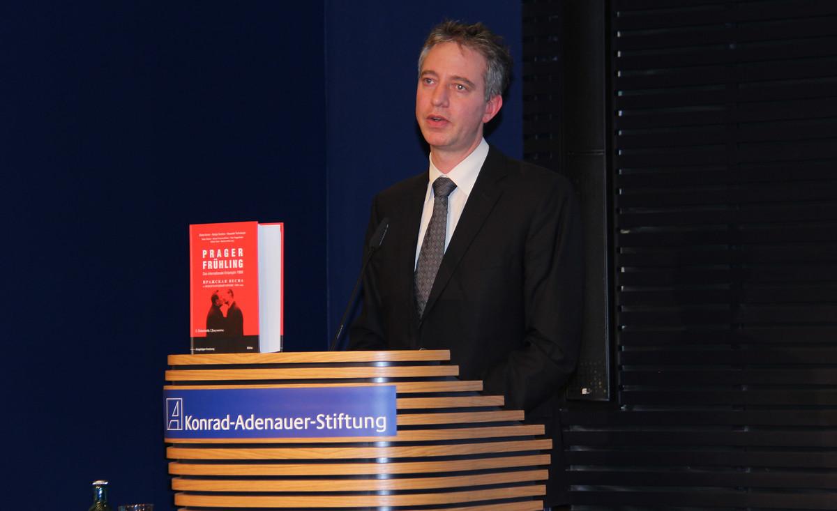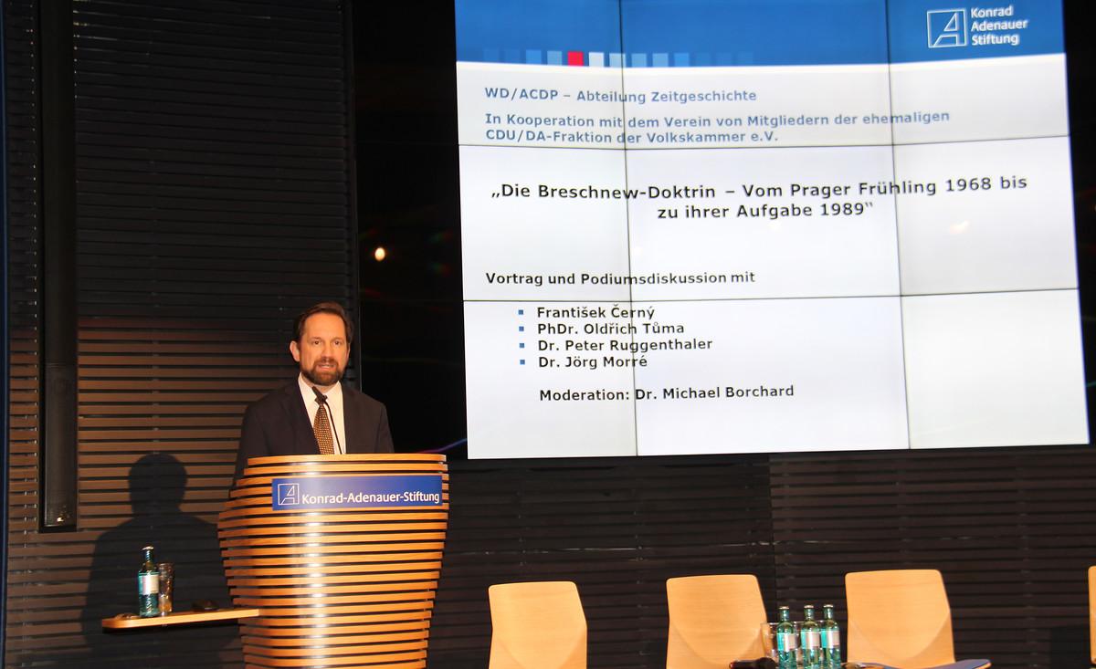 Cordula Schubert, Vorsitzende des Vereins der Volkskammerabgeordneten, und Dr. Michael Borchard, stellvertretender Leiter der Hauptabteilung Wissenschaftliche Dienste/Archiv für Christlich-Demokratische Politik (ACDP), begrüßten die rund 90 Gäste. Cordula Schubert erklärte, dass mit dem jährlichen Treffen der Abgeordneten daran erinnert werden sollte, dass die Bürgerrechtsbewegung und die frei gewählte Volkskammer einen wesentlichen Beitrag zur Überwindung der Diktatur geleistet haben. Dr. Michael Borchard ergänzte, dass die Reihe deshalb auch dazu diene, den Bürgerrechtlern „ein Denkmal zu setzen“, da die Volkskammerwahl nicht zuletzt ein Votum für eine rasche Wiedervereinigung war. Im Mittelpunkt der diesjährigen Veranstaltung stehe die Breschnew-Doktrin, weil sie kurz nach der Niederschlagung des Prager Frühlings 1968 verkündet wurde und ihre Aufgabe 1989 eine Kehrtwende in der sowjetischen Außenpolitik markiere. Diese sei eine der Voraussetzungen für die Friedliche Revolution und die Wiedervereinigung gewesen.