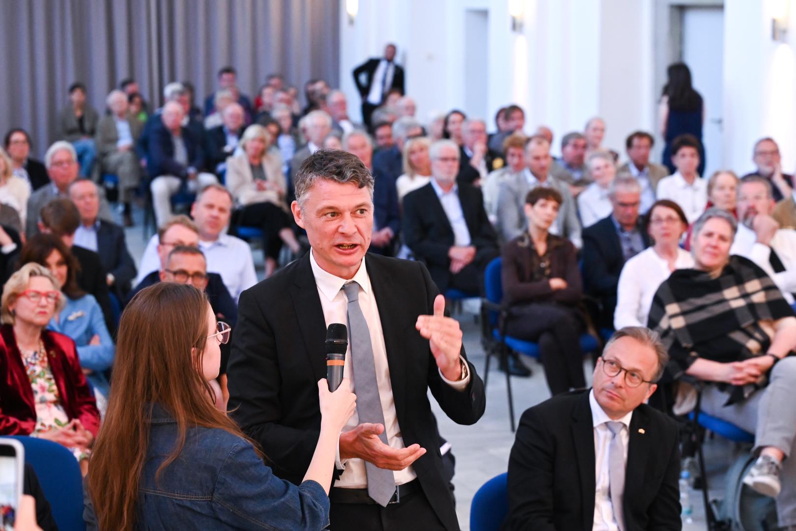 Während er die Standortbestimmung der deutsch-israelischen Freundschaft und die gemeinsamen Herausforderungen der Zukunft für beide Länder in den Blick nahm, erzählte Ron Prosor auch immer wieder kleine Anekdoten aus seinem Privatleben und über seine Rolle als Botschafter. Diese persönlichen Geschichten sorgten für eine ausgelassene Stimmung und hielten das Publikum bis zum Schluss gespannt.