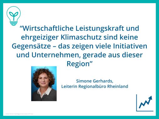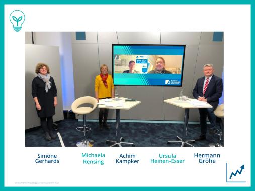 An der Diskussion haben die Ministerin für Umwelt, Landwirtschaft, Natur- und Verbraucherschutz in Nordrhein-Westfalen, Ursula Heinen Esser und Prof. Achim Kampker, Wissenschaftler und Gründer von „Ingenieure retten die Erde e.V.“, teilgenommen. Zunächst begrüßte die Leiterin des Regionalbüros Rheinland Simone Gerhards die Zuschauerinnen und Zuschauer und sprach über die Rahmenbedingungen von nachhaltiger Wirtschaft: „Wirtschaftliche Leistungskraft und ehrgeiziger Klimaschutz sind keine Gegensätze. Aber für eine langfristige Veränderung sind nicht nur die Unternehmen wichtig - es werden Rahmenbedingungen und neue Erkenntnisse der Wissenschaft benötigt.“