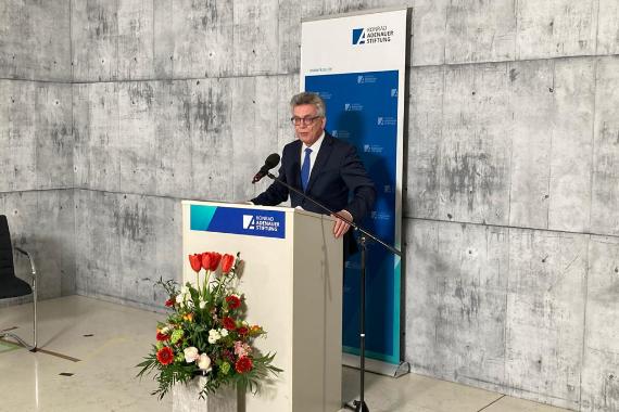 Als Regierender Bürgermeister von Berlin habe er die Modernisierung der West-Berliner CDU als Großstadtpartei vorangetrieben und sei dabei bereit gewesen, die Ansprüche einer vielfältigen Gesellschaft in Berlin zu berücksichtigen. Dort und später als Bundespräsident sei ihm die Verbindung von Freiheit und Sicherheit gelungen. „Richard von Weizsäckers kluge Beiträge zur Ambivalenz zwischen Moral und Politik, zwischen Werten und Interessen in der Außen- und Sicherheitspolitik, auch davon würde ich mir mehr in unseren – sehr deutschen – Debatten wünschen“, so de Maizière. Schließlich würdigte de Maizière Weizsäcker als erfolgreichen Intellektuellen in der Politik, der die Gabe besessen habe, „aus dem Kleinen das Große entwickeln zu können. Und umgekehrt: Aus dem großen Weltgeschehen konnte er meisterhaft und scheinbar mühelos Konsequenzen und Bedeutungen für den Einzelnen ableiten.“