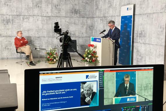 Am 15. April 2020 wäre Richard von Weizsäcker 100 Jahre alt geworden. Der von der Konrad-Adenauer-Stiftung und der Stiftung Ernst-Reuter-Archiv aus diesem Anlass geplante Festakt musste letztes Jahr wie so viele Veranstaltungen aufgrund der Pandemie abgesagt werden. Dass dies eine Veranstaltung sei, „die wir sicherlich nachholen wollen“ – auch wenn dies derzeit nur digital möglich sei –, betonte Norbert Lammert, Vorsitzender der Konrad-Adenauer-Stiftung, in seiner Einführung. Schließlich sei Weizsäcker eine „Identifikationsfigur, in dessen Leben sich ein ganzes Jahrhundert deutscher und europäischer Geschichte“ widerspiegle. Lammert schilderte Weizsäcker aus seiner eigenen Erinnerung als beeindruckenden Redner. Vor allem hob er Weizsäckers Rolle als programmatischer Impulsgeber der CDU und seine Rede 40 Jahre nach dem Ende des Zweiten Weltkriegs am 8. Mai 1985 hervor, die ein „Meilenstein in der Erinnerungskultur unseres Landes“ geworden sei.