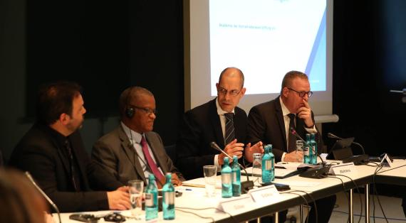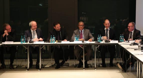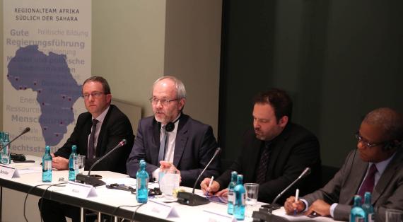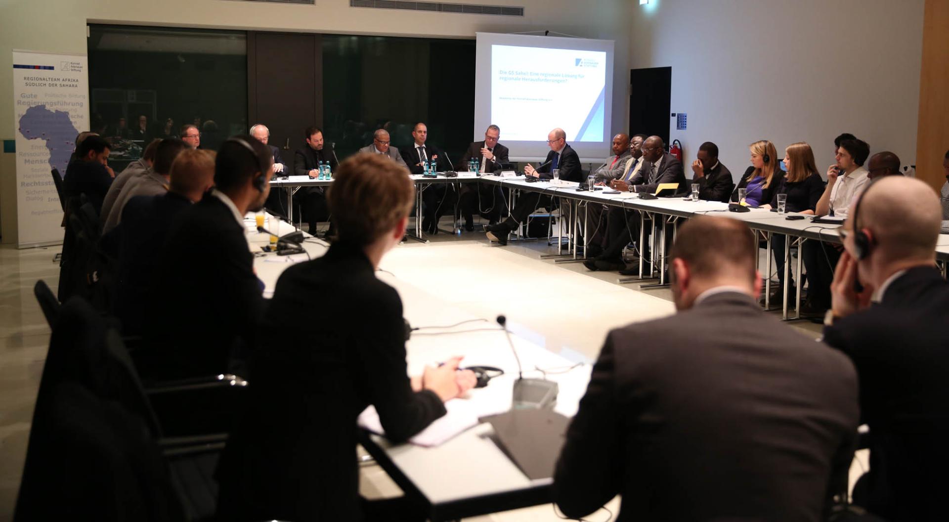 In der Akademie der Konrad-Adenauer-Stiftung diskutierten am 19. Februar 2019 nach einem Impulsvortrag von Maman Sambo Sidikou, dem ständigen Sekretär der G5 Sahel, Volkmar Klein MdB, Sprecher der CDU/CSU-Bundestagsfraktion für Wirtschaftliche Zusammenarbeit und Entwicklung, Oberstleutnant Jens Ludwig, Militärischer Berater beim Verteidigungsminister der Republik Mali und Koordinator der Ertüchtigungsinitiative G5 Sahel sowie der Leiter des Regionalprogramms Sahel der Konrad-Adenauer-Stiftung, Thomas Schiller, moderiert von Alexander Göbel.