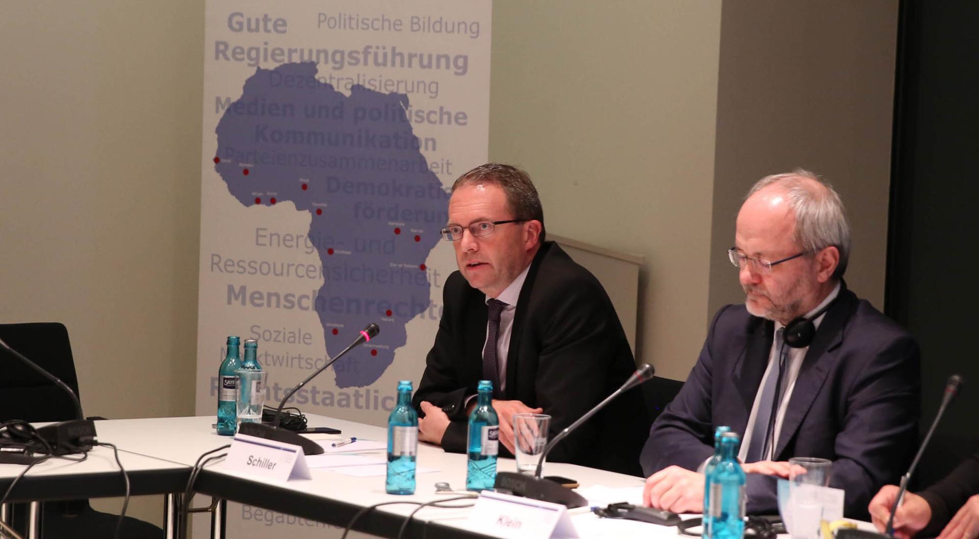 Alleine die Größe der Region macht die Infrastrukturentwicklung schwierig. Zugleich sei die Aufgabe, staatliche Strukturen für die Bürger greifbarer zu machen, eine Herausforderung für alle Beteiligten, führte Thomas Schiller, Stiftungsvertreter in Mali, aus. Sein Votum, die grenzübergreifenden Engagements zu stärken und gerade nicht die regionalen Grenzen erneut einzuziehen, fand große Zustimmung bei den Diskutanten. Der Bundestagsabgeordnete Volkmar Klein unterstrich, dass Deutschland aus ethischen Gründen seine Hilfe leiste, jedoch auch von Eigeninteressen geleitet sei. Auch Oberstleutnant Ludwig schilderte die herausfordernde Sicherheitslage und betonte, dass jede Hilfe vor allem Zeit benötige. Militärische und zivilgesellschaftliche Ertüchtigung stünden beim Engagement der Bundesrepublik vor Ort im Vordergrund.