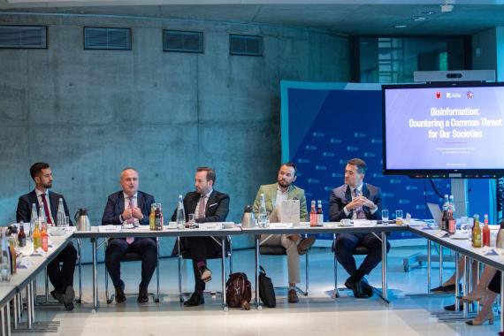 Das zweite Panel befasste sich mit Desinformationsstrategien. Von herausgehobener Bedeutung war dabei die Frage, was insgesamt sinnvolle Herangehensweisen sind, um den verschiedenen Erscheinungsformen der Desinformation wirksam zu begegnen. Der Botschafter Kroatiens in Deutschland, S. E. Gordan Bakota, und der Geschäftsträger a. i. der Botschaft von Montenegro in Deutschland, Zdravko Jovović, gaben Einschätzungen zur Situation in ihren Ländern. Dr. Christopher Nehring, Adenauer Fellow und Gastdozent für Desinformation und Geheimdienste an der Universität Sofia, betrachtete die Situation im Westlichen Balkan von der politischen Metaebene aus. Dabei ging er auch auf die bisherigen „Lessons Learned“ ein. Darüber hinaus präsentierte Alejandro González, der das Thema Desinformation in der spanischen Regierungszentrale betreut, die Ziele des spanischen EU-Ratsvorsitzes.