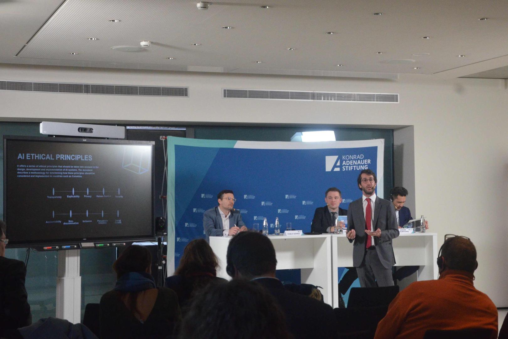 Pablo Gomez Ayerbe, wissenschaftlicher Mitarbeiter an der TU München mit Berufserfahrung als KI-Berater im kolumbianischen Präsidialamt, stellte im Anschluss das Beispiel „Digital Colombia“ vor und berichtet über KI und die digitale Verwaltung in Kolumbien. Das Aufzeigen, dass Kolumbien seine digitale Verwaltung durch eine Strategie der Bürgerbeteiligung und Einbeziehungen der UNESCO-Prinzipien für ethischen Umgang mit KI erreicht hat, stand dabei im Vordergrund.