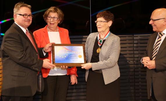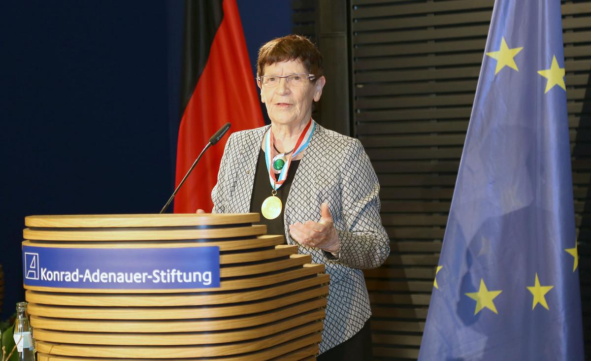 Die Preisträgerin verkörpere all das, was eine „Politikerin als Dienerin der res publica“ ausmachen sollte, konstatierte Richard Kühnel. Ihre Standfestigkeit und Agilität in politischen Belangen sei beispielhaft und daher gerade in Zeiten des aufschwellenden Populismus in Europa notwendiger denn je, so der Leiter der Vertretung der Europäischen Kommission in Deutschland weiter. Sie habe nie die Auseinandersetzung gescheut, sich die Neugierde nach dem jeweils anderen bewahrt und sei mit Optimismus vorangegangen. Für Rita Süssmuth sei Politik, war der EU-Beamte überzeugt, nicht Macht, sondern Gestaltungsaufgabe. Mit Blick auf die Zukunft hielt Kühnel somit fest: „Wir brauchen mehr Politiker wie Rita Süssmuth.“ Nach der feierlichen Überreichung der Ordnungsinsignien ergriff die Laureatin schließlich selbst das Wort. Die momentane Werte-Krise in Europa sei mehr als ein „Faserriss“. Umso wichtiger sei es, sich den Herausforderungen dieser Krise zu stellen und den Austausch zwischen den Gesellschaften aufrechtzuerhalten. Auffordernd resümierte die Europäerin Süssmuth: „Wir haben so viel Potential; wir können die Auseinandersetzung gewinnen. Lassen wir uns also etwas einfallen.“