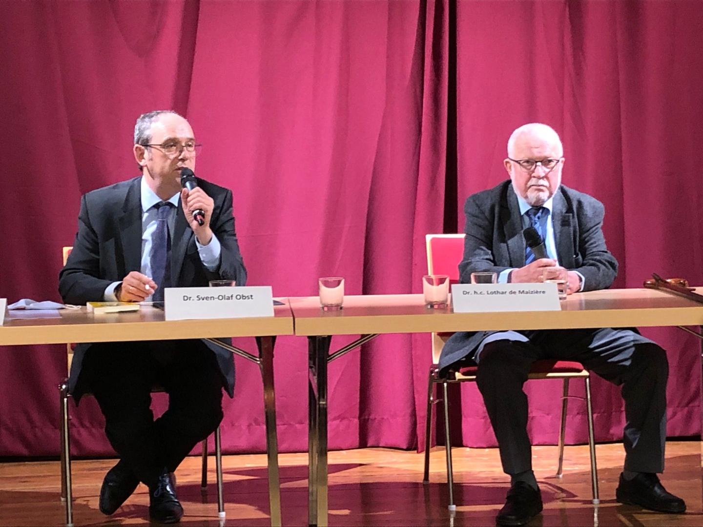 Warum wir uns heute immer noch in manchen Dingen so schwer im Miteinander von Ost und West tun, ist für Lothar de Maizière einerseits eine Frage von regionalen Prägungen und Mentalitäten, aber auch eine Frage eines teilweise immer noch vorhandenen Rückstands oder eines Gefühls, weiterhin zurückgesetzt zu sein, im Osten gegenüber dem Westen. Irgendwann werde es aber kein „Ossi“ und „Wessi“ mehr geben, schaute Lothar de Maizière optimistisch in die Zukunft.