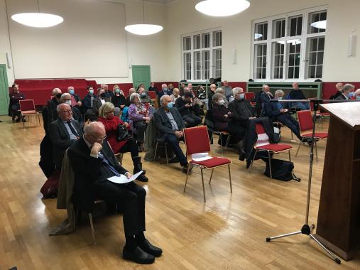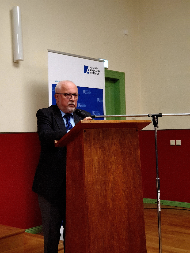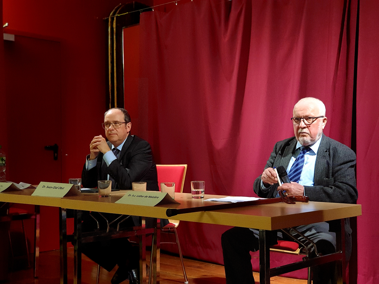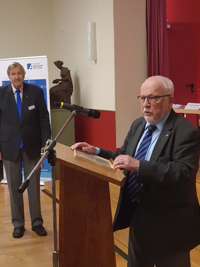 In zwei weiteren Beiträgen ehrten Prof. Dr. Hans Joachim Meyer und der Vorsitzende der Seniorenunion Brandenburgs, Ingo Hansen, Lothar de Maizière als einen Vater der Deutschen Einheit. Meyer, der Minister für Bildung und Wissenschaft in der Regierung de Maizière und danach zwölf Jahre Kultusminister in Sachsen war, beschrieb die schwierige Situation, in der damals verhandelt wurde, ohne dass man gegenseitig all zu viel Ahnung vom Leben im Osten oder Westen gehabt hätte. Er kritisierte dabei eine Attitüde im Westen, die darauf zielte, der sogenanten „Laienspielschar“ im Osten das Heft aus der Hand zu nehmen, um den Osten dann in Ordnung zu bringen. Dem habe sich Lothar de Maizière geschickt widersetzt und selbst die Dinge vorangetrieben. Den lesens- und bedenkenswerten Beitrag von Prof. Meyer veröffentlichen wir separat auf unserer Internetseite. Ingo Hansen überreichte Lothar de Maizière zum Abschluss der Veranstaltung die Ehrenurkunde der Seniorenunion Brandenburg für Verdienste um die Deutsche Einheit verbunden mit einer Ehrennadel.