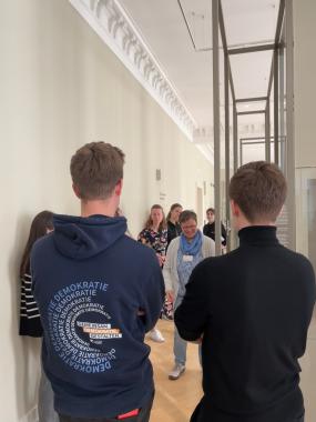 Das zweite Obergeschoss „Tradition und Ritual“ widmete sich den Veränderungen und den verschiedenen Strömungen des jüdischen Glaubens. Insbesondere die digitale Fragerunde mit Rabbinerinnen und Rabbinern aus Frankfurt stieß auf großes Interesse bei den Schülerinnen und Schülern. Im letzten Teil der Führung lag der zeitliche Fokus auf der Nachkriegsgeschichte bis zur Gegenwart. Hierbei wurden die Folgen des Nationalsozialismus anhand ausgewählter persönlicher Biografien thematisiert und die Mitwirkung von Jüdinnen und Juden in Frankfurt nach der Nachkriegszeit beleuchtet.