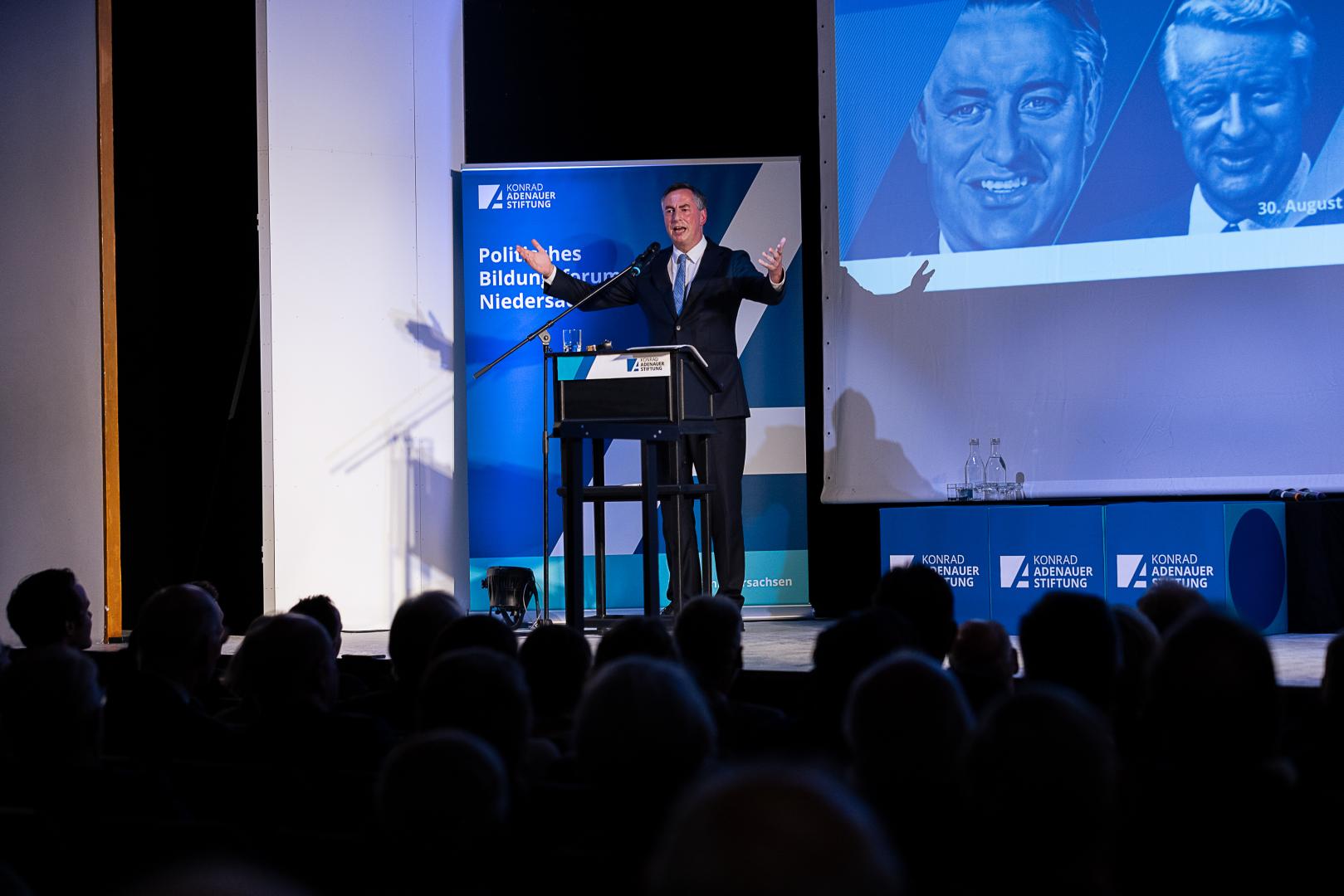 Festredner der Veranstaltung war der ehemalige Ministerpräsident David McAllister, der Hasselmann als junger Landtagsabgeordneter und im Wahlkampf 2003 als CDU-Generalsekretär kennengelernt hatte. Hasselmann sei über mehr als 20 Jahre lang die Integrationsfigur der CDU in Niedersachsen gewesen, sein politischer Weg sei von vielen großen Erfolgen, aber auch schweren Enttäuschungen geprägt gewesen. So habe er zweimal, bei der Landtagswahl 1970 und der Landtagswahl 1974, mit einem schwungvollen und leidenschaftlichen Wahlkampf glänzende CDU-Ergebnisse erzielt – doch die Machtperspektive blieb beide Male der Partei verwehrt. Er konnte, obwohl Spitzenkandidat, nicht Ministerpräsident werden. 1974 sei der Landtagswahlkampf kurz vor dem Wahltermin durch den Kanzlerwechsel von Willy Brandt zu Helmut Schmidt überschattet worden – plötzlich habe Landespolitik keine Rolle mehr gespielt. „Ein Mandat fehlte der CDU zur Mehrheit – und ich selbst kann sehr gut nachvollziehen, wie bitter dieser Moment für ihn gewesen sein muss“, sagte McAllister. McAllister selbst hatte bei der Landtagswahl 2013 mit einem hauchdünnen Ergebnis gegen Rot-Grün verloren – auch damals lag die Mehrheit für die neue Koalition bei nur einem Mandat im Landtag.