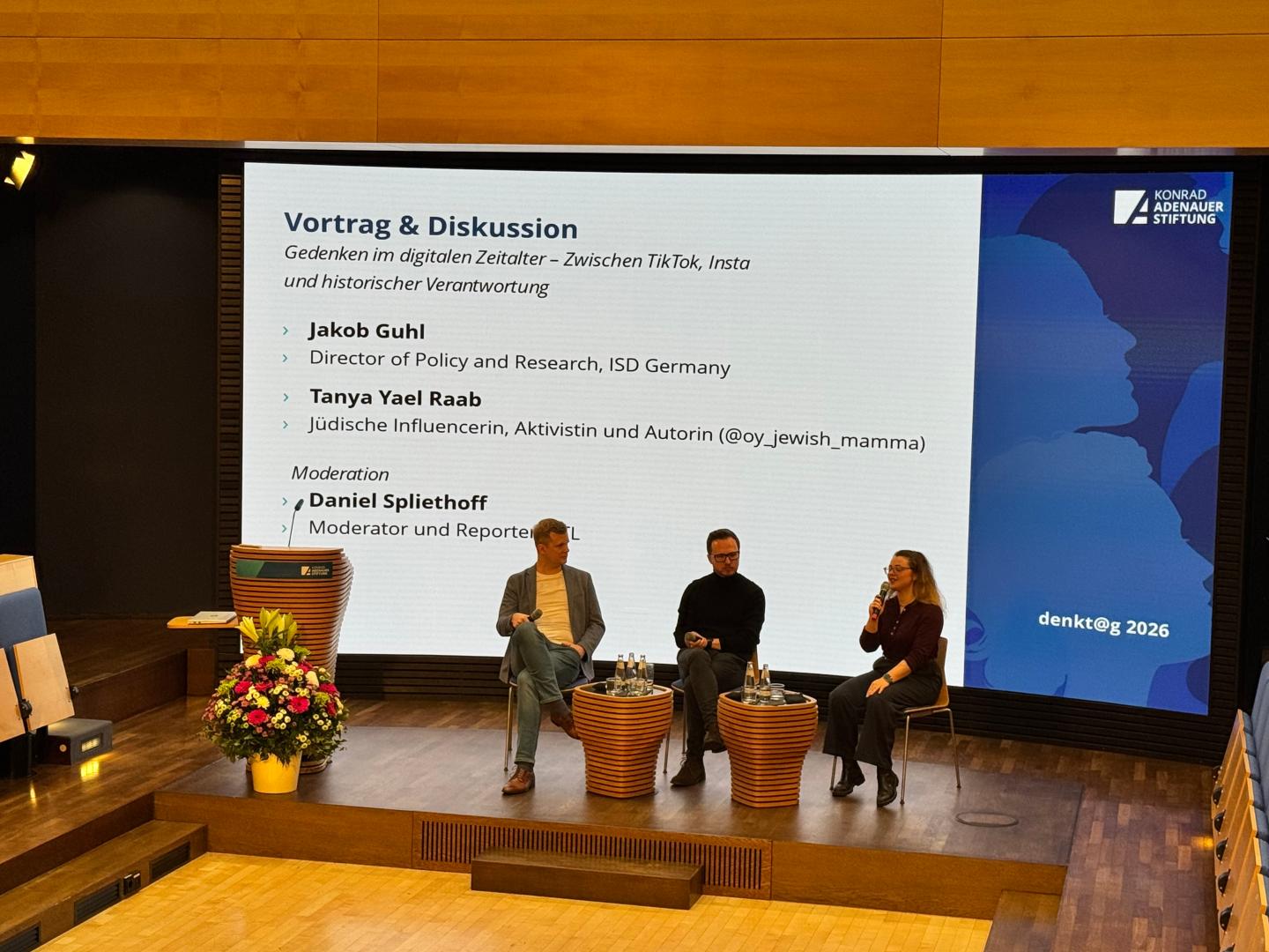 An den Vortrag schloss sich eine moderierte Diskussion an, an der neben Jakob Guhl auch Tanya Yael Raab, jüdische Influencerin, Aktivistin und Autorin, teilnahm. Moderiert von Daniel Spliethoff brachte Raab eine praxisnahe Perspektive ein und berichtete über Herausforderungen und Gefahren ihres Engagements im digitalen Raum. Gemeinsam mit den Jugendlichen diskutierten die Teilnehmer unter anderem über den Umgang mit KI-generierten Inhalten zum Holocaust, die Verbreitung von Falschinformationen und antisemitischen Narrativen im Netz sowie über Risiken und Chancen digitaler Medien für die Erinnerungskultur. Darüber hinaus wurde thematisiert, wie sich Erinnerung angesichts schwindender Zeitzeugenschaft weiterentwickeln kann und welche Verantwortung jede und jeder Einzelne trägt, Erinnerung gemeinsam zu bewahren.
