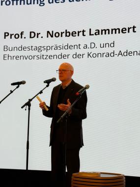 Nach der Präsentation der Workshop-Ergebnisse erfolgte die offizielle Eröffnung des „denkt@g“-Wettbewerbs durch Prof. Dr. Norbert Lammert, Schirmherr der Veranstaltung. Der Ehrenvorsitzende der Konrad-Adenauer-Stiftung und ehemalige Bundestagspräsident richtete in diesem Rahmen ein Grußwort an die Teilnehmenden und erklärte: