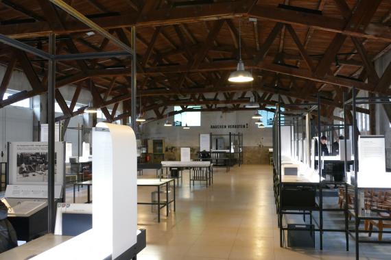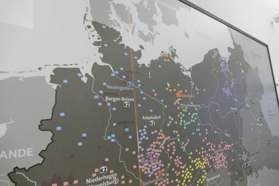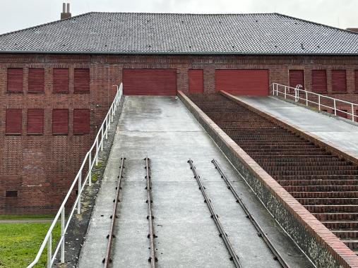 Zu Beginn der Führung beurteilten die Schülerinnen und Schüler mithilfe des Guides, was auf dem Außengelände zu erkennen war. Zahlreiche flache Gabionen markieren die Grundrisse der abgerissenen Baracken. Diese waren unterteilt in Unterkunfts- und Funktionsbaracken. Der Gruppe wurde zudem erklärt, dass alle Gefangenen jeden Morgen eine halbe Stunde Zeit hatten, um die Toiletten zu nutzen und sich zu waschen, bevor es zum morgendlichen Appell ging. Jedoch wurden für einen Block, in dem ca. 1000 Menschen unterkommen mussten, nur 20 Toiletten und Waschbecken zur Verfügung gestellt. Auf dem Gelände befinden sich heute noch insgesamt 17 Gebäude, die man besichtigen kann. Unter anderem steht immer noch das Klinkerwerk, in dem die Gefangenen Zwangsarbeit leisten mussten.