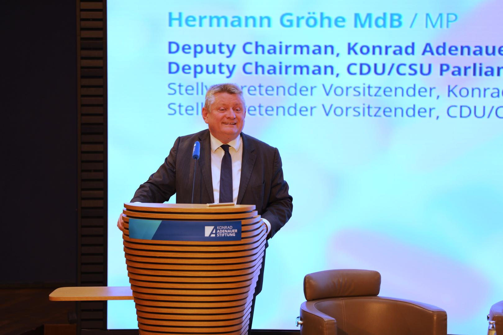 Der stellvertretende Vorsitzende der Konrad-Adenauer-Stiftung und stellvertretende Vorsitzende der CDU/CSU-Bundestagsfraktion Hermann Gröhe begrüßte die Anwesenden und verwies auf die Meldungen zu Engpässen bei der Arzneimittelversorgung in Deutschland, die es in den vergangenen Monaten und Jahren immer wieder gab – ob bei Fiebersäften für Kinder, Cholesterinsenkern, bestimmten Antibiotika oder gar Insulin und Medikamenten zur Krebsbehandlung. Dieser zunehmende Medikamentenmangel gefährde die Versorgungssicherheit und somit Menschenleben und es bedürfe wirksamer Maßnahmen, um dem zu begegnen. Weiter betonte er, dass Arzneimittelknappheit kein allein deutsches Problem sei, sondern es sich um eine globale Herausforderung für die Gesundheitssysteme handle. Das treffe nicht nur auf Industrienationen zu, sondern ebenso auf Länder mit niedrigem und mittlerem Einkommen. Ursachen gebe es viele und sie seien von Land zu Land unterschiedlich. Neben lokalen Faktoren gebe es die globale Dimension, wie etwa die der internationalen Lieferketten, die durch die Covid-19-Pandemie empfindlich gestört wurden, wodurch das Problem mit einem Mal sehr sichtbar wurde. Gröhe verwies auf das DFG-geförderte Forschungsprojekt der Hertie School und der Universität Duisburg-Essen, das in den vergangenen drei Jahren die unterschiedlichen Ursachen und Folgen von Medikamentenmangel untersuchte und das mit dieser Fachkonferenz zu einem Ende komme. Er hob die Bedeutung der wissenschaftlichen Auseinandersetzung mit dem Thema hervor, damit es fundierte Erkenntnisse gebe, um die Ursachen effektiv bekämpfen zu können. Hierzu sei der Dialog zwischen Wissenschaft, Politik und Industrie wichtig. Genauso wichtig sei es, dabei auch europäische und internationale Blickwinkel zu berücksichtigen, wozu diese Konferenz einen Beitrag leisten wolle. Er dankte den an der Studie beteiligten Wissenschaftlerinnen und Wissenschaftlern sowie den Forscherinnen und Forschern, die während der Konferenz ihr Wissen und ihre Erkenntnisse geteilt und diskutiert hätten. Auch dankte er dem Bundesverband der Deutschen Industrie (BDI) für die Unterstützung der Konferenz, wodurch der Dialog zwischen Wissenschaft, Politik und Industrie auch in der Partnerstruktur widergespiegelt werde.