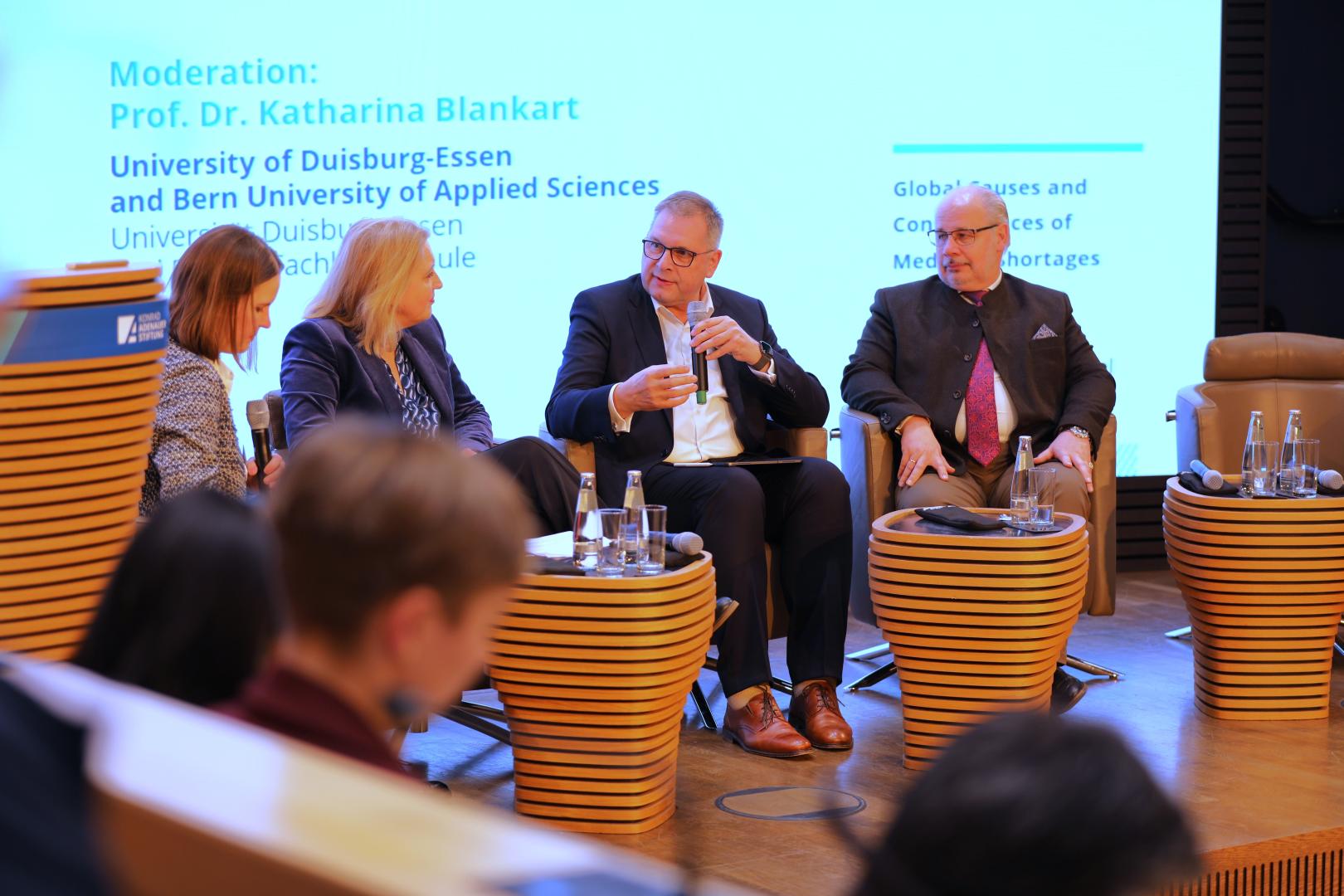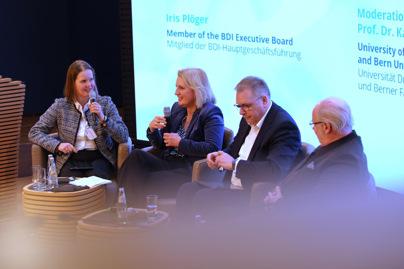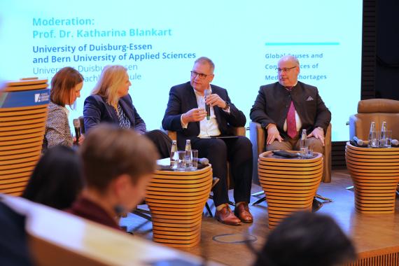 Zu europäischen Strategien für mehr Resilienz in der Medikamentenversorgung diskutierten der Präsident des Bundesinstituts für Arzneimittel und Medizinprodukte (BfArM) Prof. Dr. Karl Broich, der Obmann der CDU/CSU-Bundestagsfraktion im Gesundheitsausschuss Dr. Georg Kippels MdB und Iris Plöger, Mitglied der BDI-Hauptgeschäftsführung. Moderiert wurde die Runde durch die Co-Studienleiterin Prof. Dr. Katharina Blankart von der Berner Fachhochschule.
