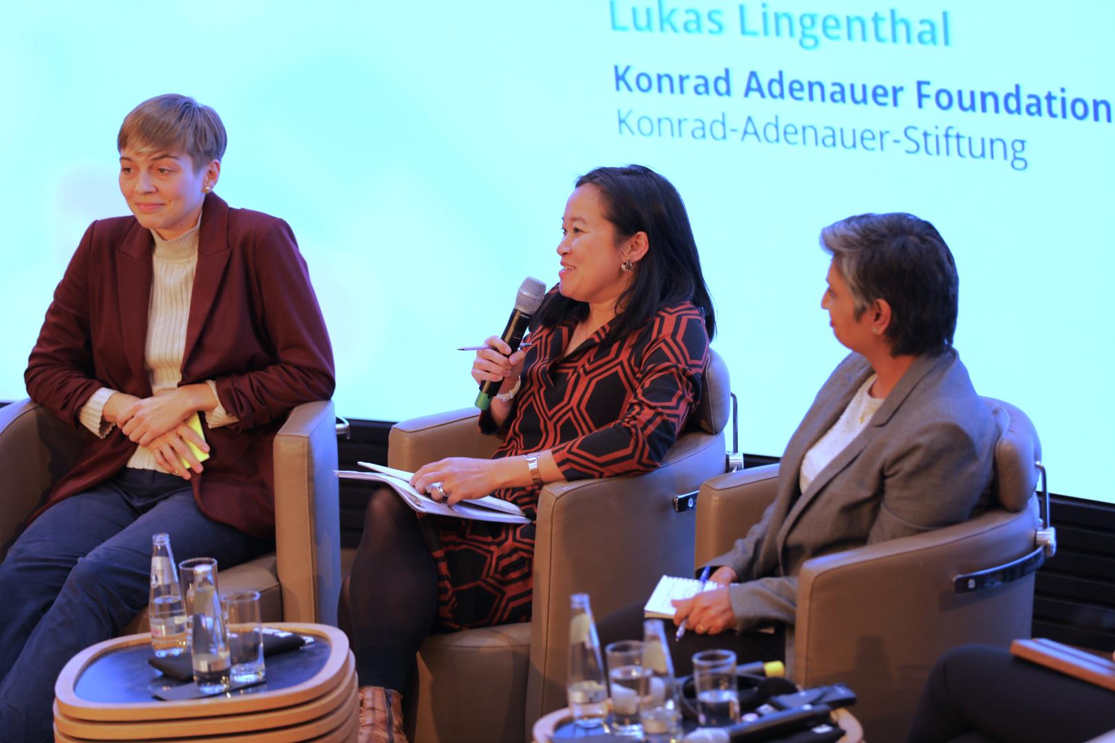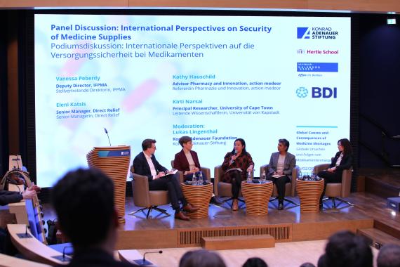 Die zweite Paneldiskussion stand unter dem Titel „Internationale Perspektiven auf die Versorgungssicherheit bei Medikamenten“ und konzentrierte sich auf relevante Faktoren im Kontext von Entwicklungs- und Schwellenländern. Hierzu diskutierten die stellvertretende Direktorin der International Federation of Pharmaceutical Manufacturers and Associations (IFPMA) Vanessa Peberdy, Kirti Narsai von der Universität Kapstadt, Eleni Katsis von Direct Relief sowie Kathy Hauschild von action medeor. Moderiert wurde die Runde durch Lukas Lingenthal von der Konrad-Adenauer-Stiftung.